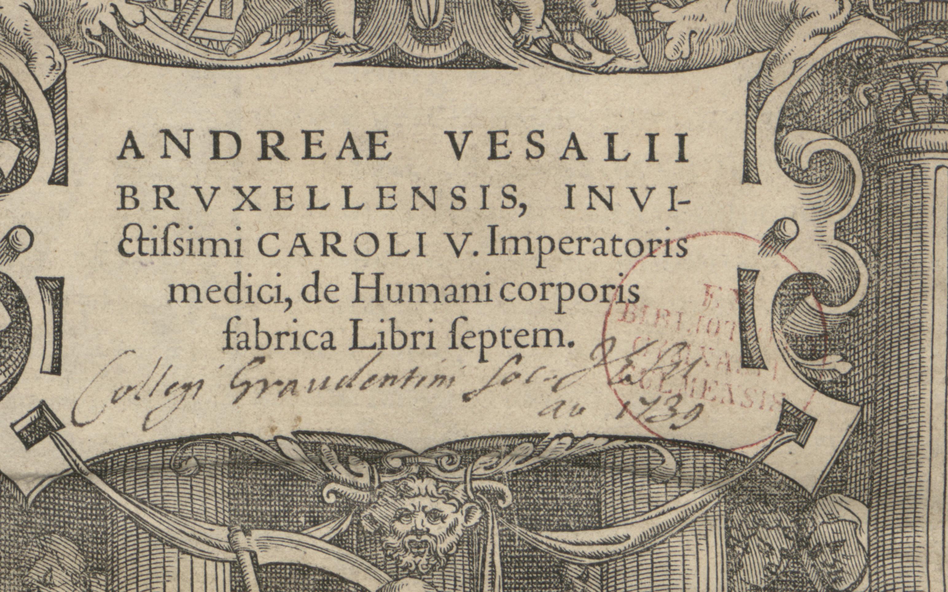 Andreae Vesalii Brvxellensis, Invictissimi Caroli V. Imperatoris medici, de Humani corporis fabrica Libri septem - strona tytułowa z okrągłą pieczątką: EX BIBLIOTHECA GYMNASII CULMENSIS
