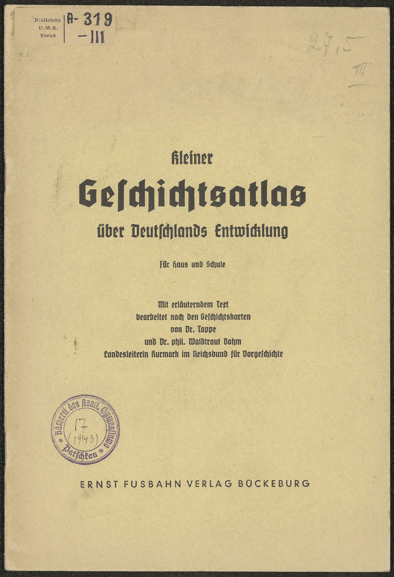 Kleiner Geschichtsatlas über Deutschlands Entwicklung : für Haus und Schule : mit erläuterndem Text bearbeitet nach den Geschichtskarten von Tappe und Waldtraut Bohm - okładka wraz z okrągłą fioletową pieczątką: Bücherei des Staatl. Gymnasiums Patschkau