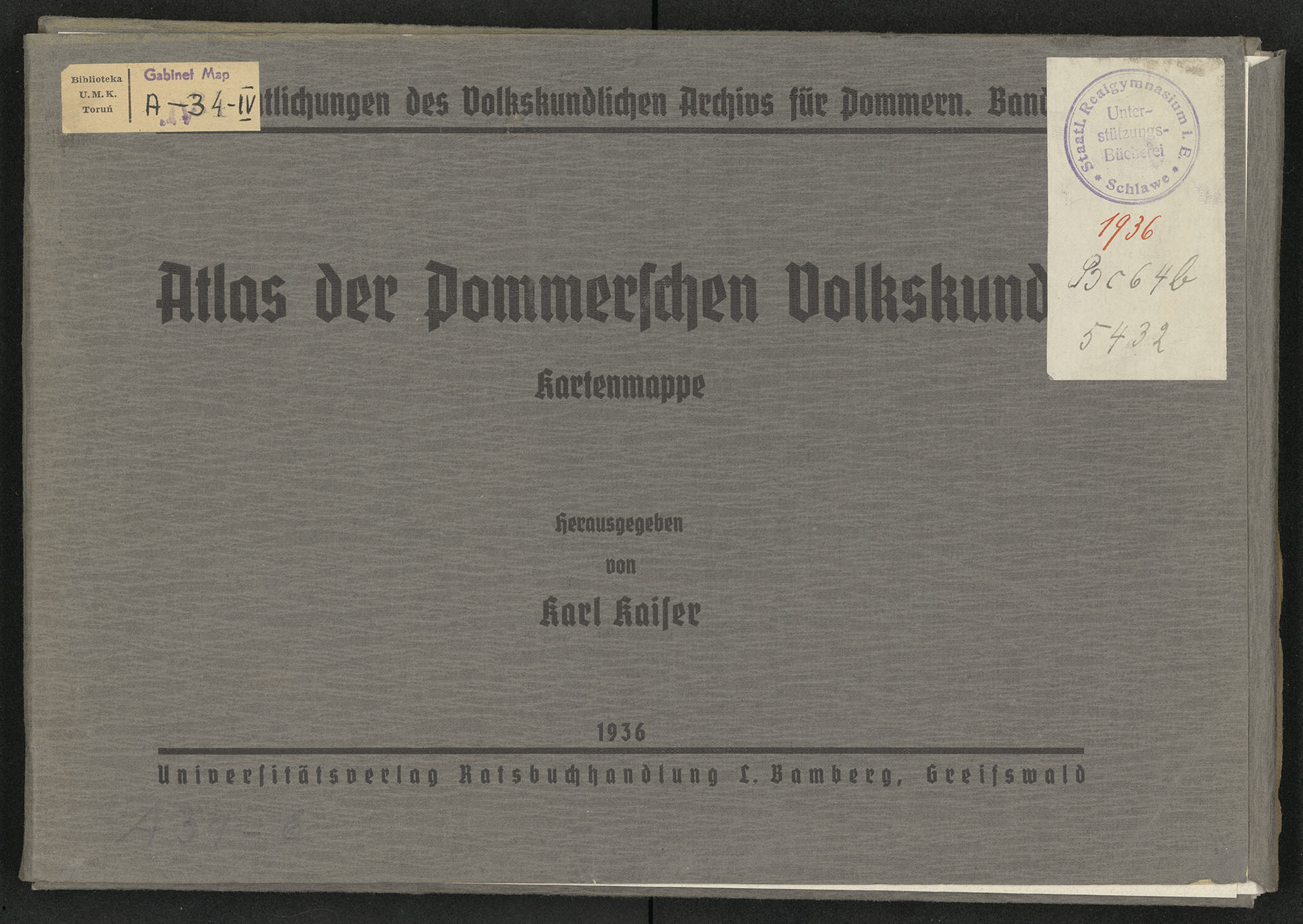 Atlas der Pommerschen Volkskunde kartenmappe - okładka z nalepką i okrągłą pieczątką: Staatl. Realgymnasium i. E. Schlawe Unter-Stützungs-Bücherei