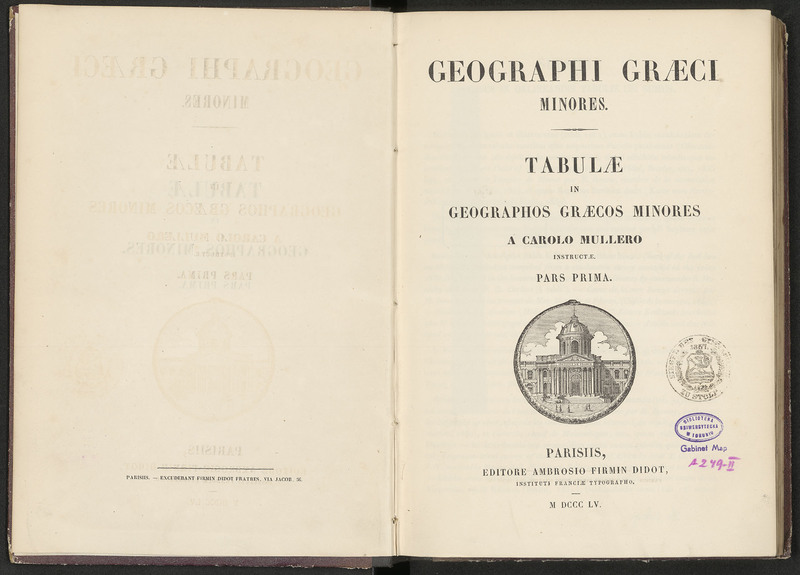 GEOGRAPHI GRAECI MINORES. TABULAE IN GEOGRAPHOS GRAECOS MINORES A CARLO MULLERO INSTRUCTAE. PARS PRIMA - strona tytułowa z okrągłą pieczątką: SIEGEL DES GYMNASIUMS ZU STOLP