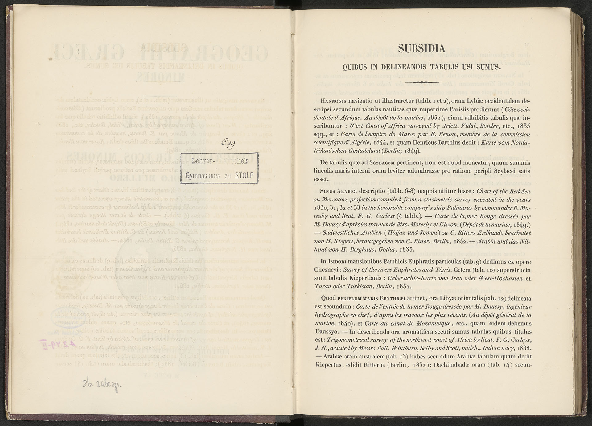 GEOGRAPHI GRAECI MINORES. TABULAE IN GEOGRAPHOS GRAECOS MINORES A CARLO MULLERO INSTRUCTAE. PARS PRIMA - strona z prostokątną pieczątką: Lehrer-Bibliothek des Gimnasiums zu STOLP