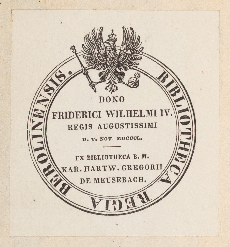 Der Clorinden Anderer Theil. Oder Liebs-Geschicht ... - ekslibris donacyjny „Bibliotheca Regia Berolinensis. Dono Friderici Wilhelmi IV Regis Augustissimi D. V. Nov. MDCCCL. Ex Bibliotheca B. M. Hartw. Gregorii De Meusebach.”