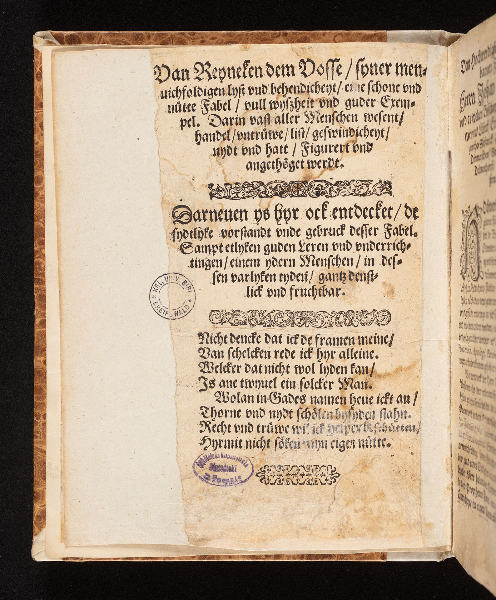 De Warheyt my gantz frömde ys De Trüwe gar seltzen, dat ys gewiß... - strona tytułowa verso z pieczątką okrągłą: "KGL. UNIV. BIBL. * GREIFSWALD *"