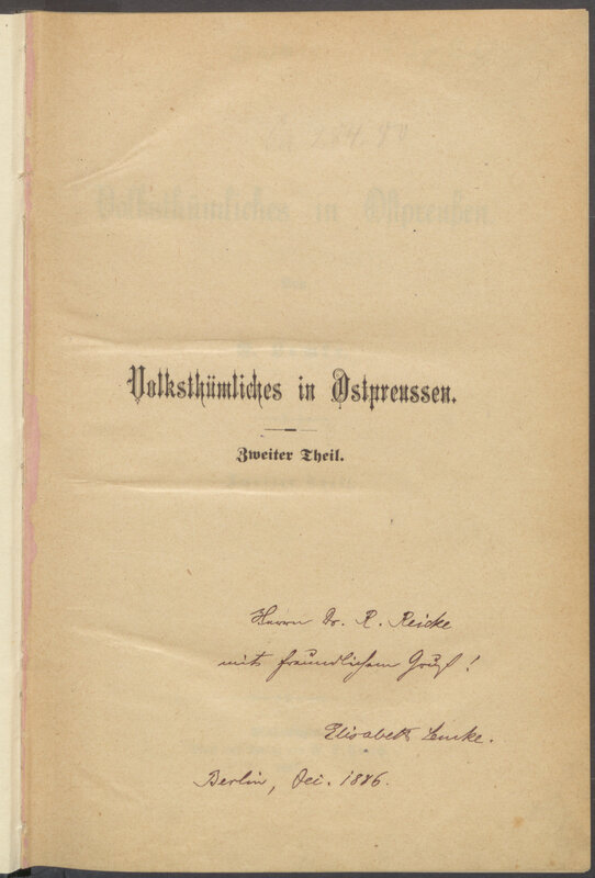 Volksthümliches in Ostpreußen T. 2 - strona z dedykacją autorską dla Rudolfa Reicke (1825-1905), niemieckiego historyka, znawcy życia i twórczości Imanuela Kanta, redaktora "Altpreussische Monatsschrift"