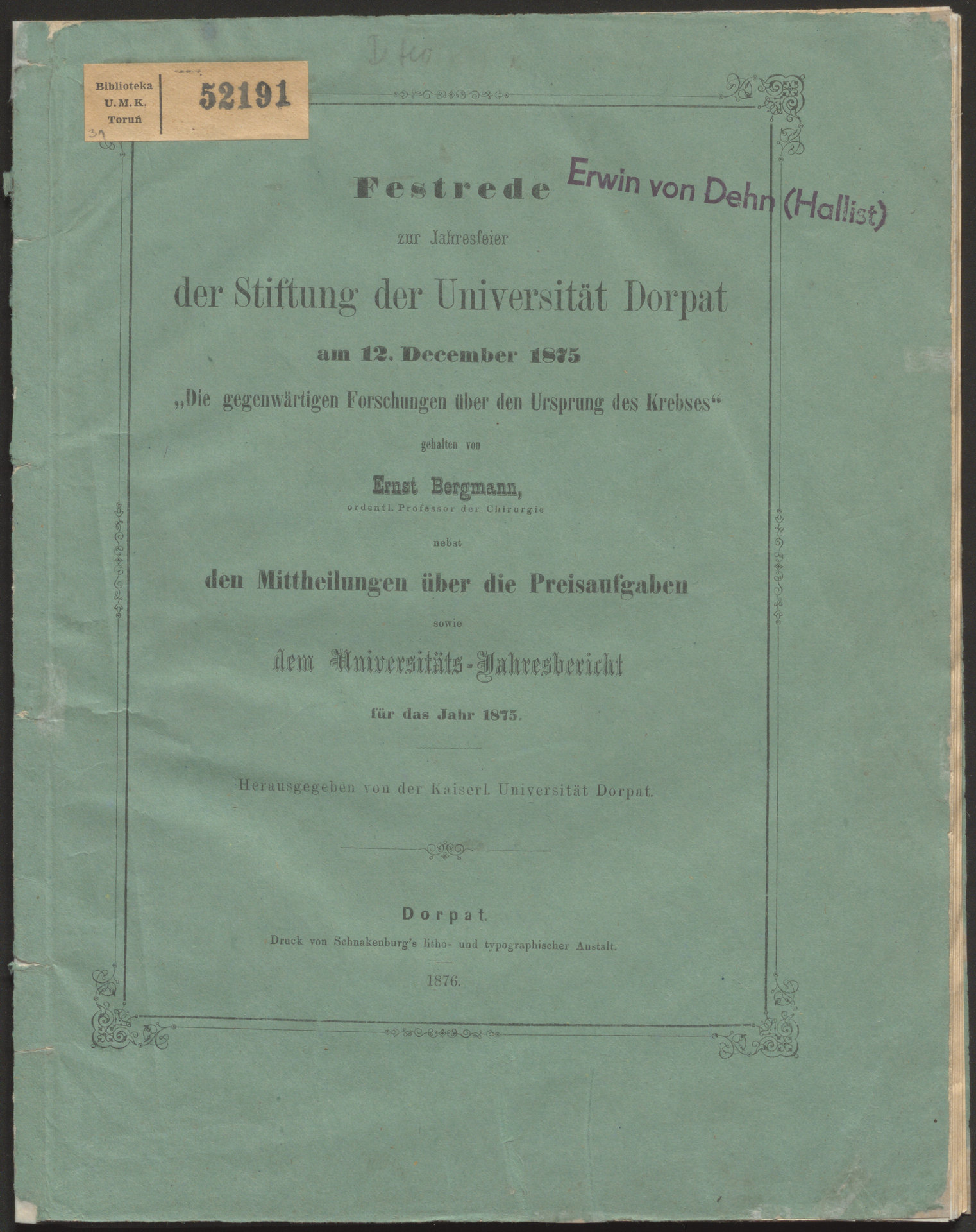 Part of Festrede zur Jahresfeier der Stiftung der Universität Dorpat am 12. December 1875 "Die gegenwärtigen Forschungen über den Ursprung des Krebses"