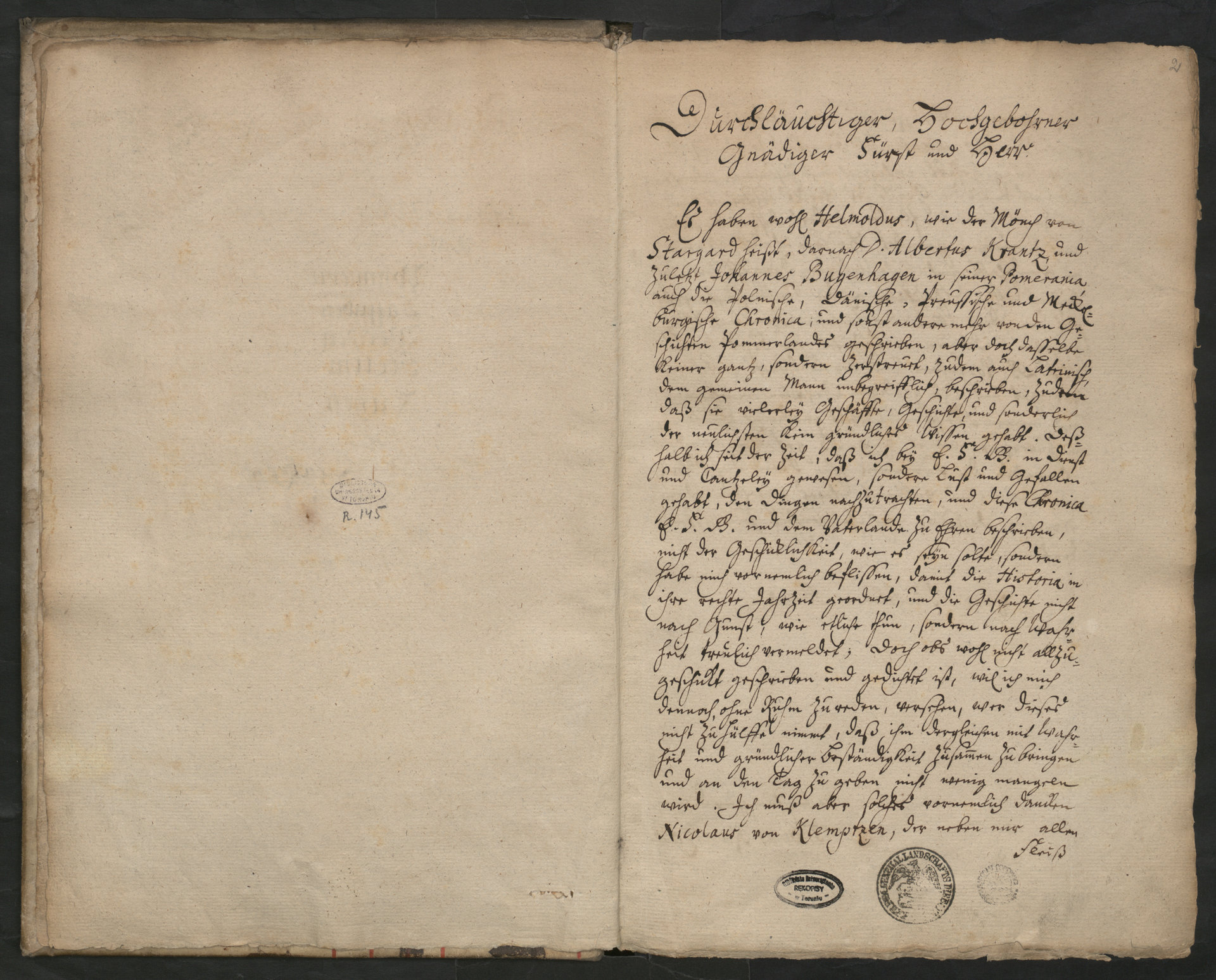 Pomerania d[as] i[st] Ursprung, Altheit und Geschichte der Völker und Lande Pommern, Cassuben, Wenden, Stettin und Rügen - karta 2 recto z pieczęcią Generalnej Dyrekcji Ziemstwa Kredytowego w Szczecinie