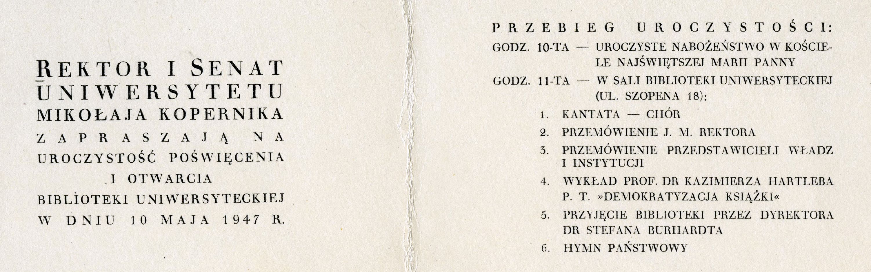 Zaproszenie na uroczystość otwarcia siedziby BU UMK przy ul. Chopina 12/18, Toruń 10 maja 1947 r.