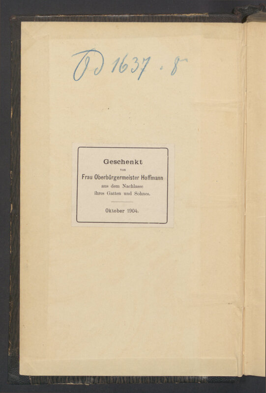 Quellenbuch zur brandenburgisch-preussischen Geschichte Bd. 1, Von der ältesen Zeit bis zum Tode Joachims I - strona z nalepką informującą o przekazaniu przez rodzinę księgozbioru burmistrza Królewca Hermanna Theodora Hoffmanna (1836-1902). Geschenkt von Frau Oberbürgermeister Hoffman aus dem Nachlasse ihres Gatten und Sohnes.