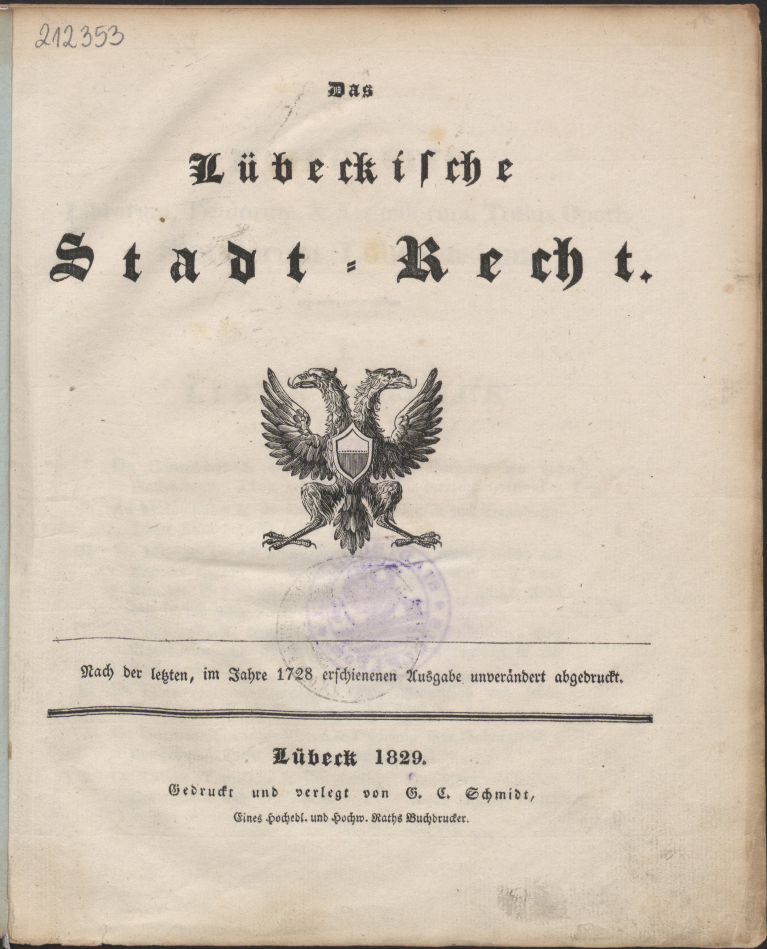 Part of Das Lübeckische Stadt-Recht : nach der letzten im Jahre 1728 erschienenen Ausgabe unverändert abgedruckt.
