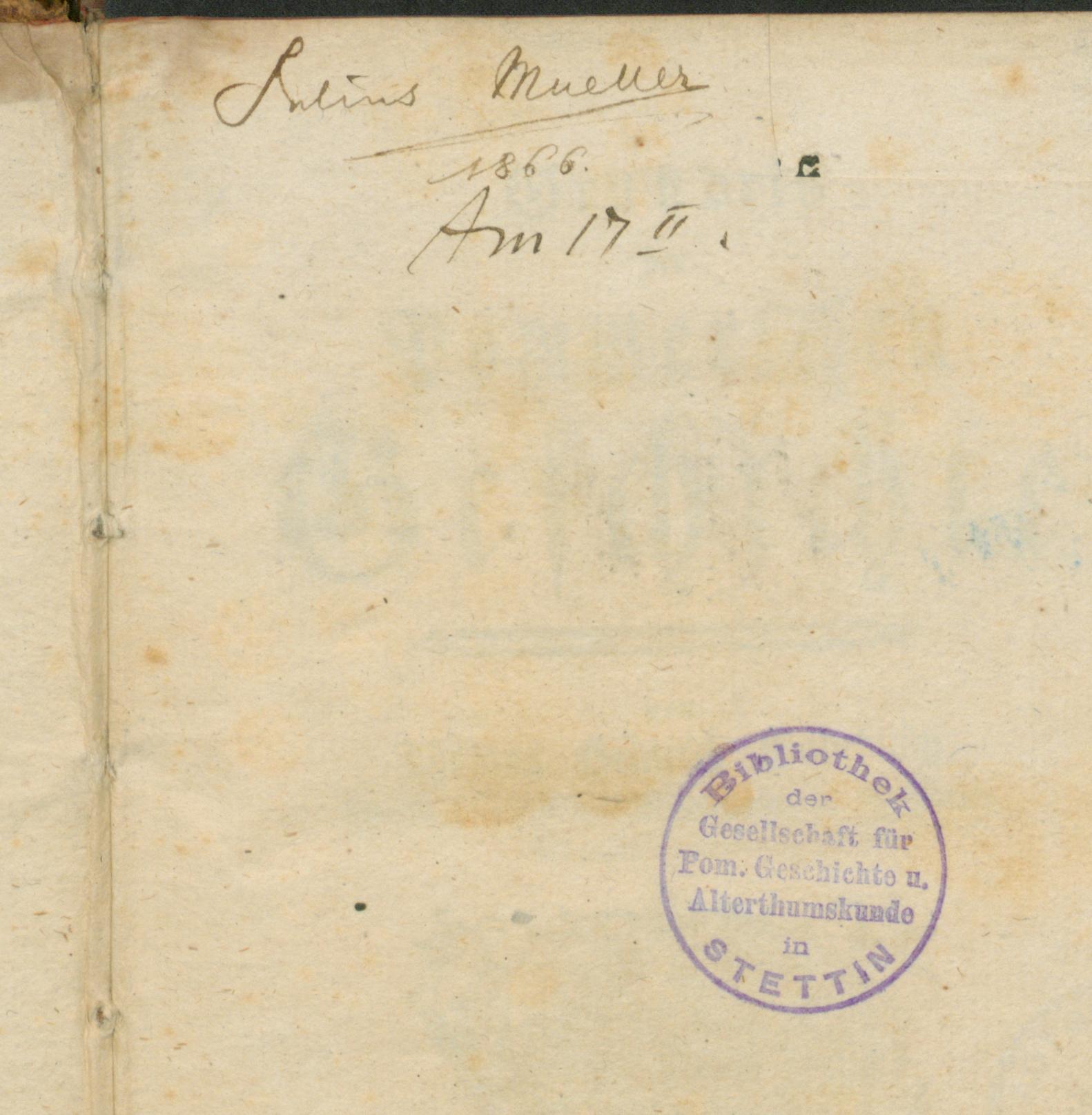 Grundriss der Pommerschen Geschichte - pieczątka okrągła: Bibliothek der Gesellschaft für Pom. Geschichte u. Alterthumskunde in STETTIN