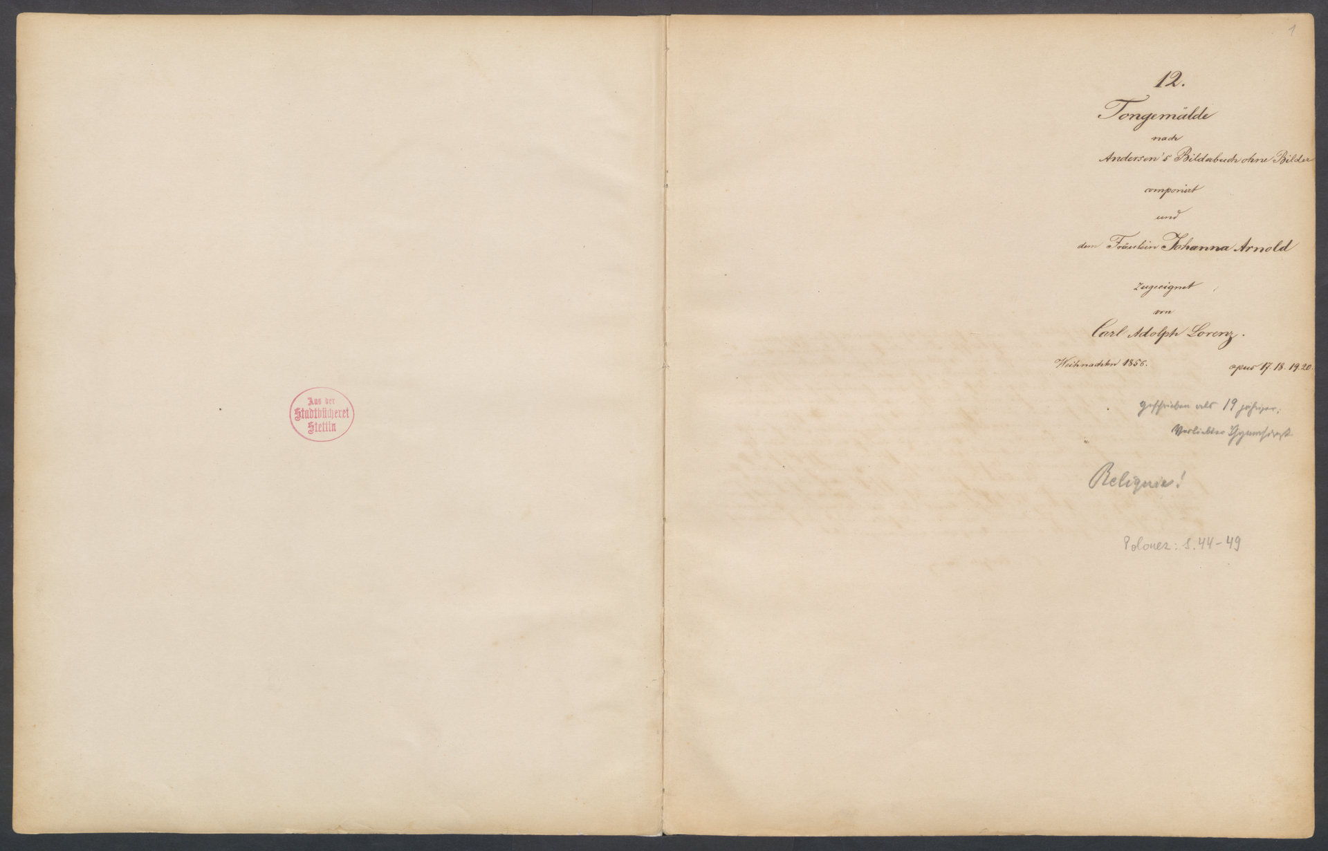 XII Tongemälde : nach Andersen's Bilderbuch ohne Bilder : [na fortepian] : op. 17, 18, 19, 20 - zapiski własnościowe na stronie tytułowej