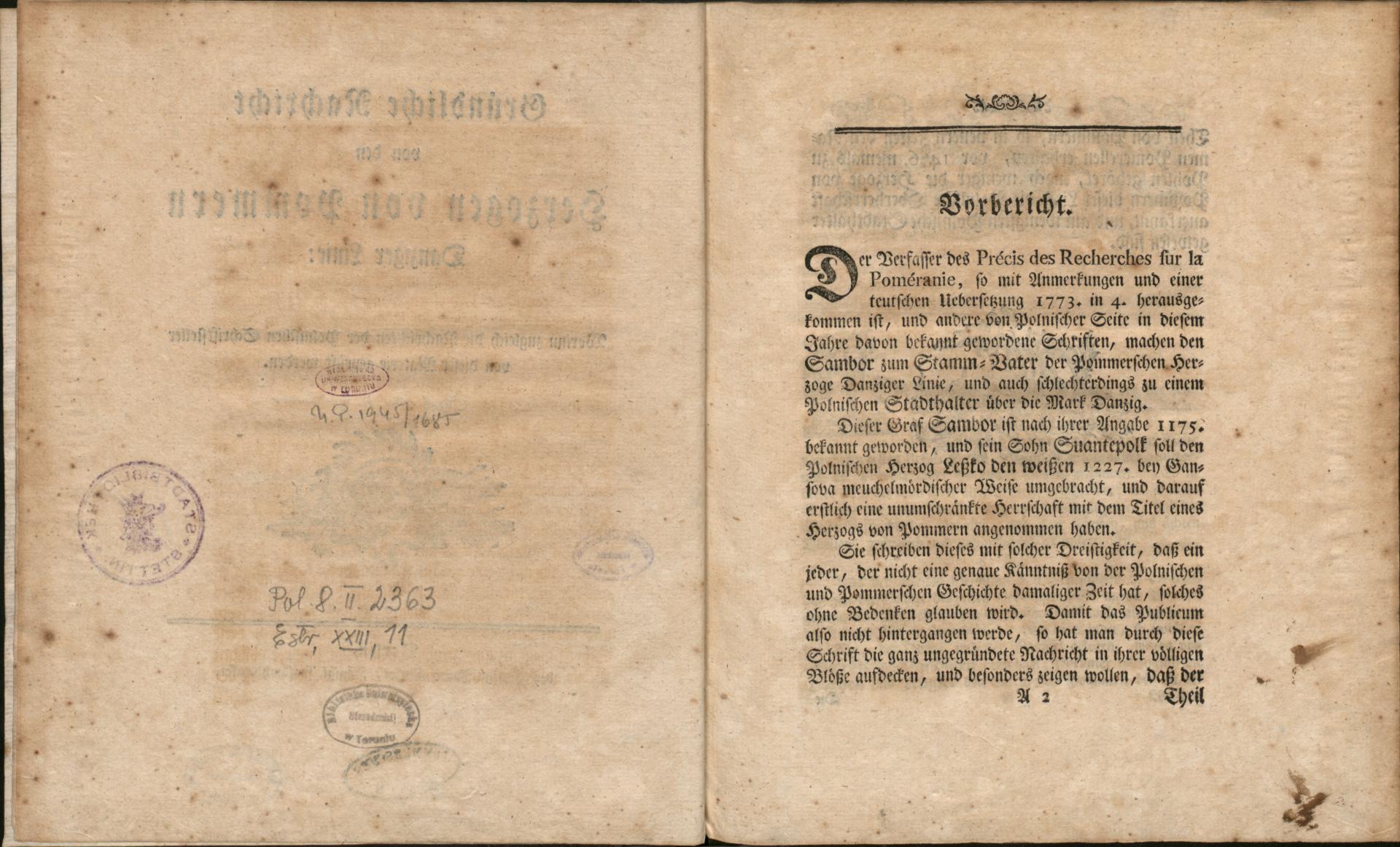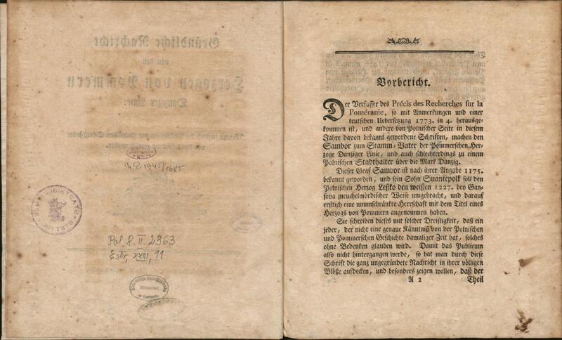 Gründliche Nachricht von den Herzogen von Pommern Danziger Linie : worin zugleich die Nachrichten der Polnischen Schriftsteller von dieser Materie geprüft werden - strony z pieczątami i sygnaturą