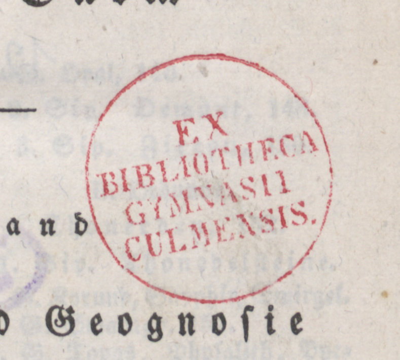 Mineralogie und Geognosie - pieczątka okrągła (czerwona) Ex Bibliotheca Gymnasii Culmensis.