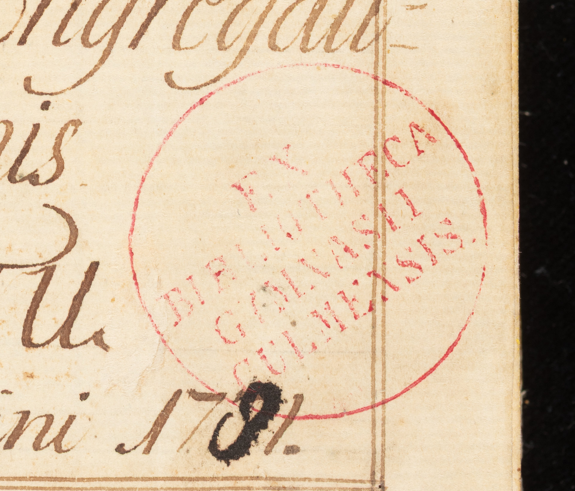 Tractatus rhetoricae ecclesiasticae praecepta ad apte utiliterque dicendas orationes sacras necessaria complectens VV [Venerabilibus] Alumnis Seminarii Lublinensis Congregationis Missionis scriptu anno Domni 1791 - okrągła pieczęć czerwonym tuszem: Ex Bibliotheca Gymnasii Culmensis (karta 1 recto)