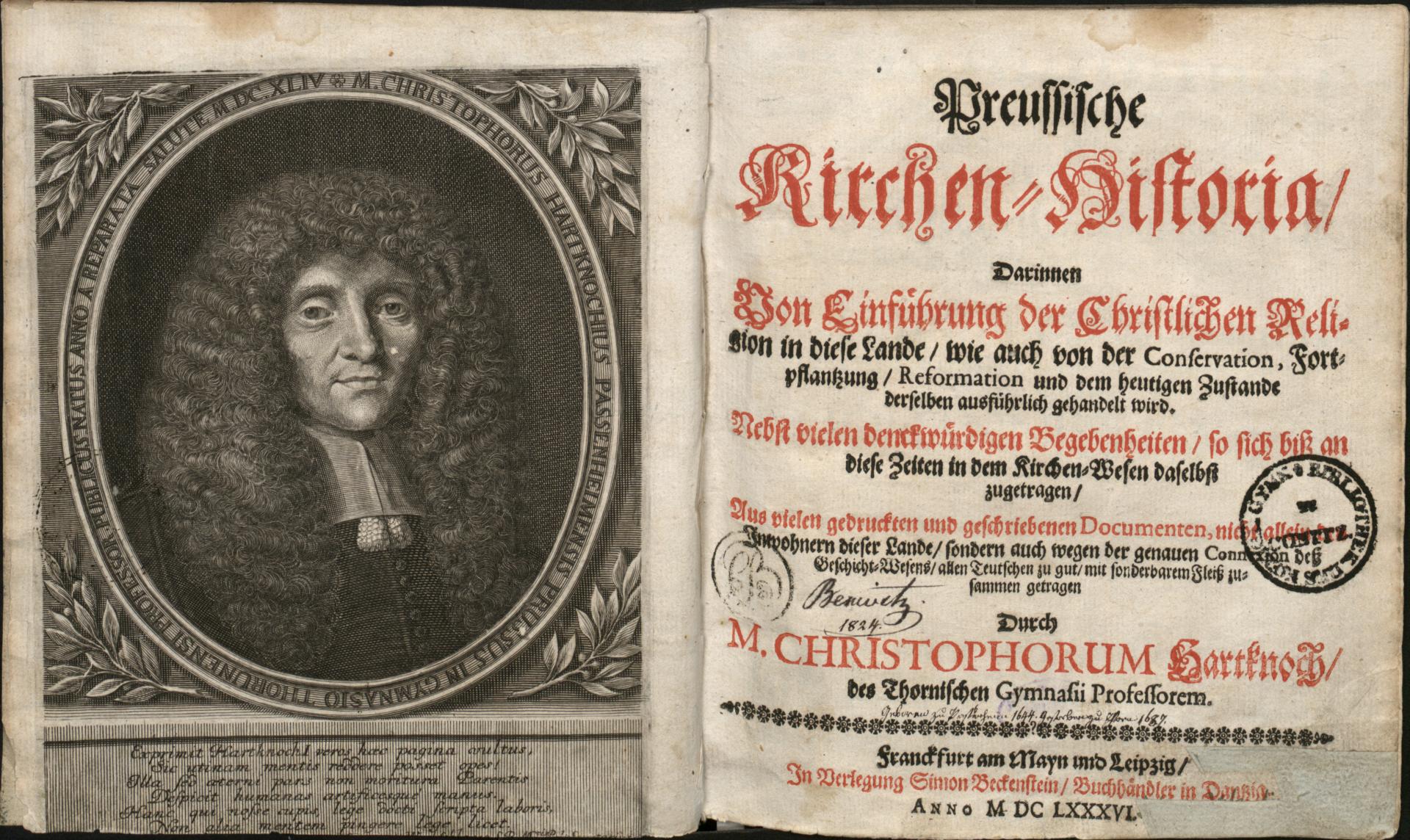 Preussische Kirchen-Historia Darinnen Von Einführung der Christlichen Religion in diese Lande, wie auch von der Conservation, Fortpflantzung, Reformation und dem heutigen Zustande derselben ausführlich gehandelt wird - strona przytytułowa oraz strona tytułowa