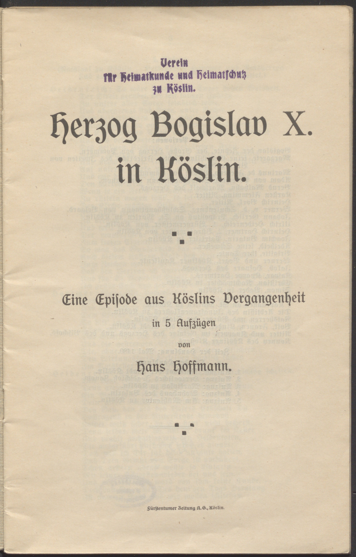 Herzog Bogislav X. in Köslin : eine Episode aus Köslins Vergangenheit in 5 Aufzügen - strona tytułowa