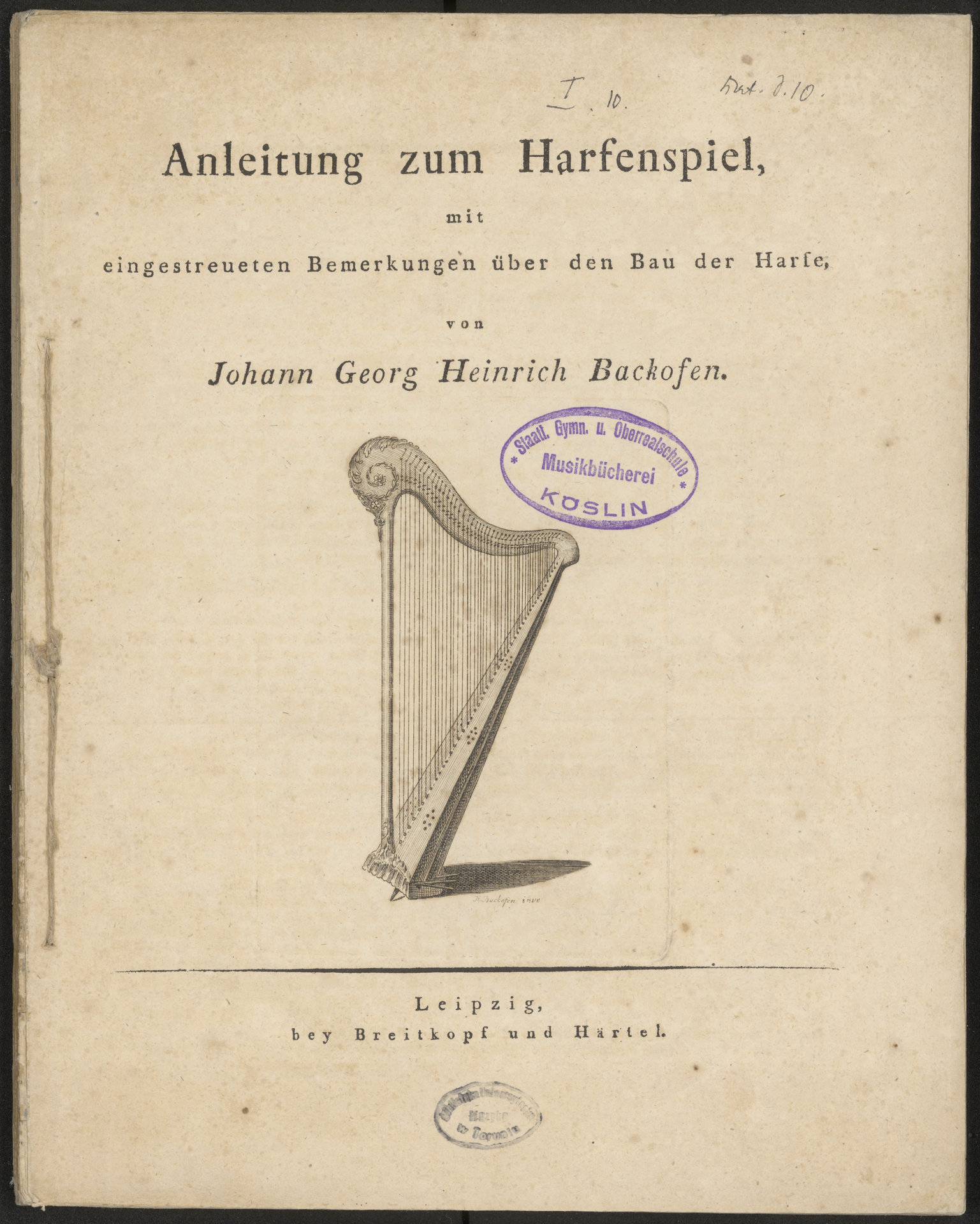 Anleitung zum Harfenspiel mit eingestreuten Bemerkungen über den Bau der Harfe - strona tytułowa z pieczęcią