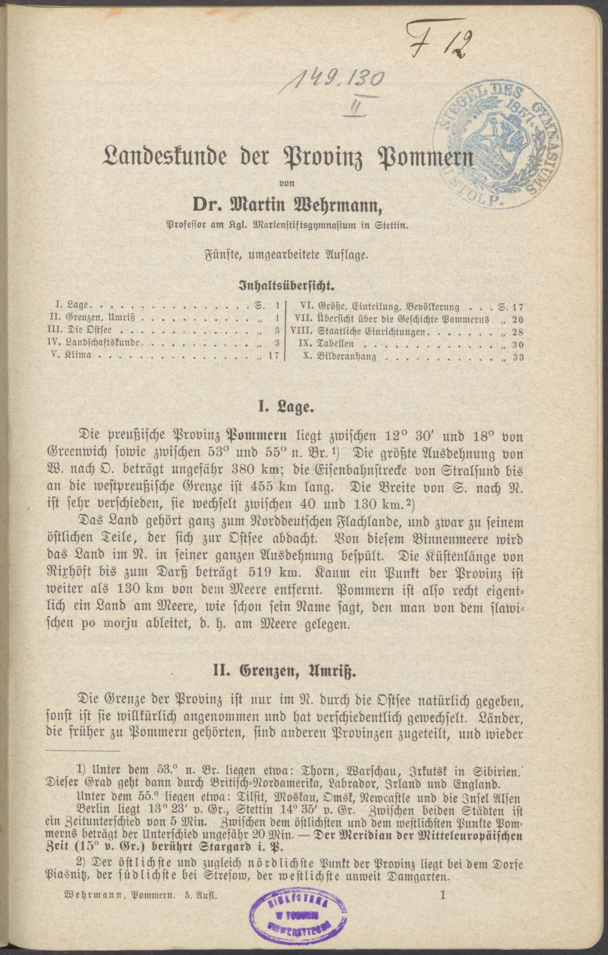 Landeskunde der Provinz Pommern - strona z pieczątką