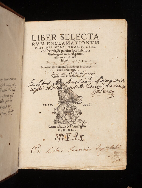 Liber Selectarvm Declamationvm Philippi Melanthonis, Qvas conscripsit & partim ipse in schola Vitebergensi recitauit partim alijs recitandas exhibuit ... - strona tytułowa z zapiską proweniencyjną: "Ex Libris ... ad Bibliotheca[m] Academiæ Culmensis"
