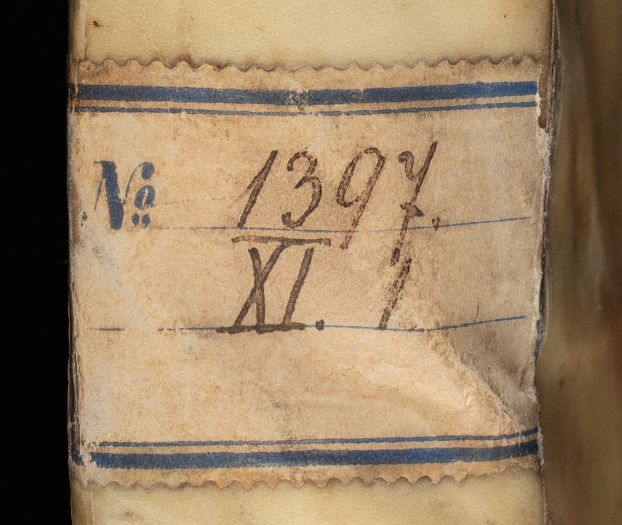 Christophori Clavii Bambergensis E Societate Iesv Geometria Practica - ząbkowana nalepka na dole grzbietu z wydrukowaną niebieską podwójną obwódką i wpisaną sygnaturą