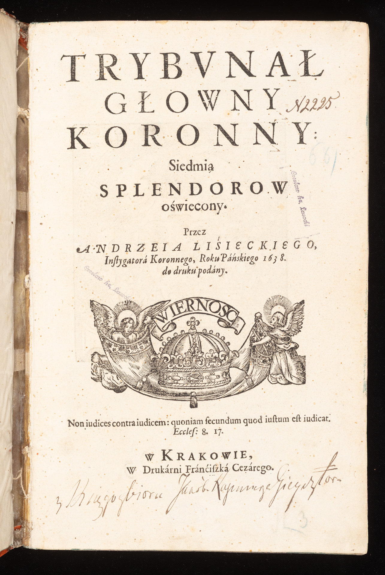 Trybvnał Głowny Koronny Siedmią Splendorow oświecony Przez Andrzeia Lisieckiego, Instygatora Koronnego, Roku Pańskiego 1638. do druku podany - karta tytułowa