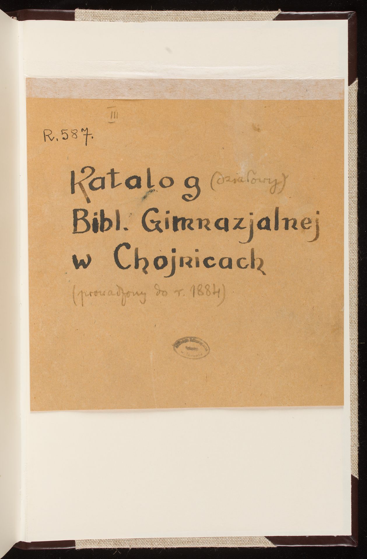 katalog działowy biblioteki gimnazjalnej w Chojnicach. Prowadzony do r. 1884 - Katalog Biblioteki Gimnazjalnej w Chojnicach (tekturka z napisem wklejona na wyklejkę dolnej okładziny)