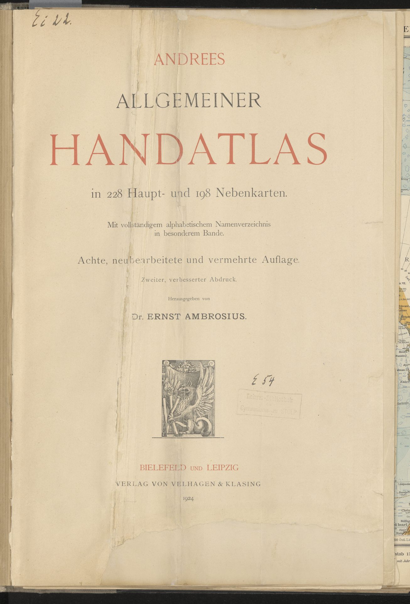 Andrees allgemeiner Handatlas in 228 Haupt- und 198 Nebenkarten. Achte neubearbeitete und vermehrte Auflage. - strona tytułowa z pieczątką