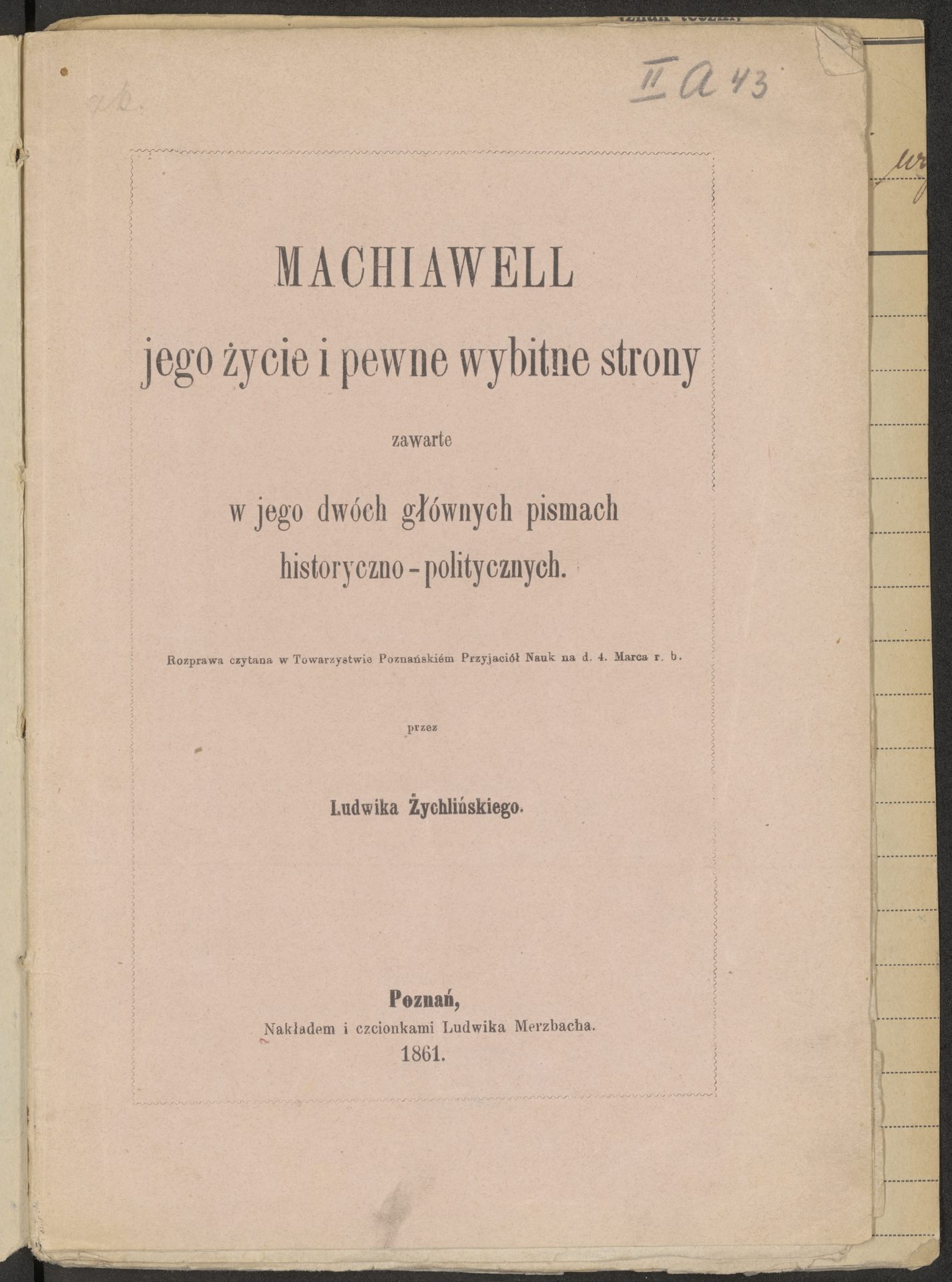 Part of Machiawell : jego życie i pewne wybitne strony zawarte w jego dwóch głównych pismach historyczno-politycznych : rozprawa czytana w Towarzystwie Poznańskiém Przyjaciół Nauk na d. 4 marca r. b.
