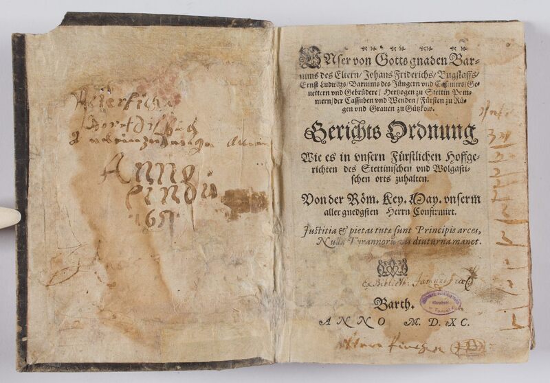 Part of Vnser von Gotts gnaden Barnims des Eltern, Johans Friderichs, Bugslaffs Ernst Ludwigs, Barnims des Jüngern vnd Casimirs, Geuettern vnd Gebrüdere, Hertzogen zu Stettin, Pommern der Cassuben vnd Wenden, Fürsten zu Rügen und Grauen zu Gützkow Gerichts Ordnung