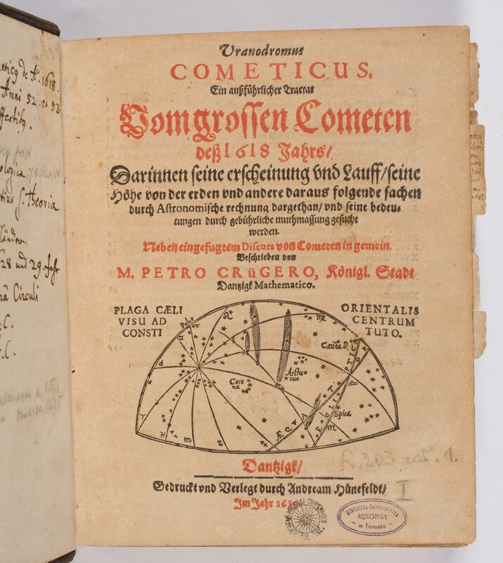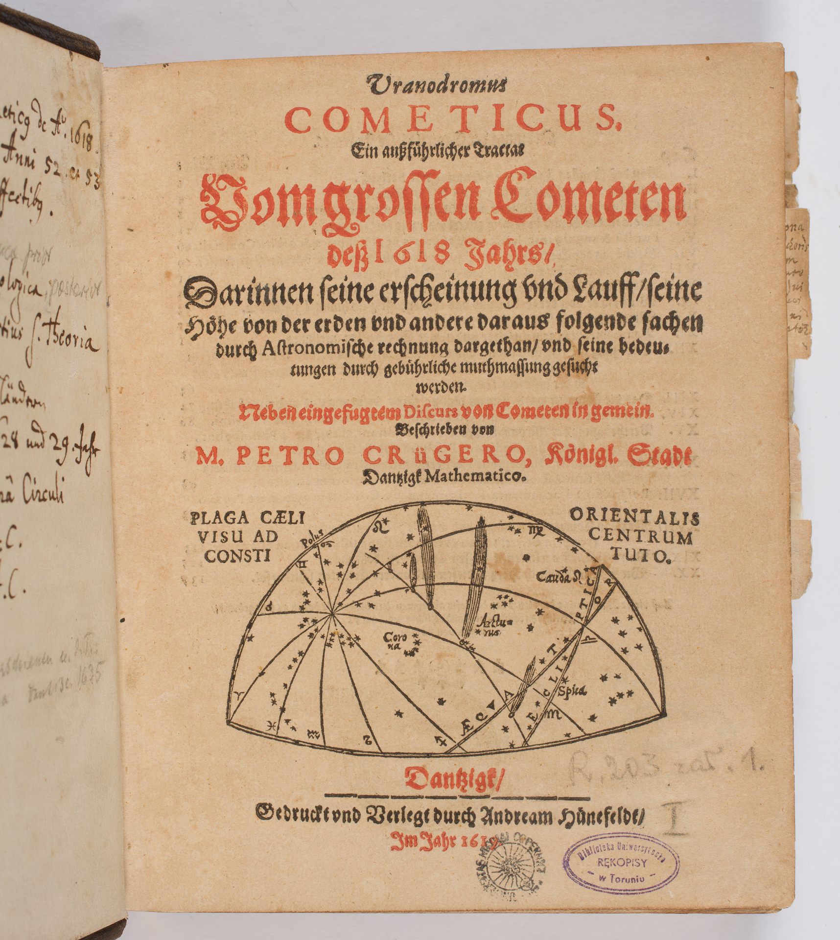 Astronomiae liber tertius (rękopis). Zbiór druków z zakresu astronomii z 1. połowy XVII w. profesorów Gimnazjum Akademickiego w Gdańsku – karta tytułowa druku nr 1 w klocku (Uranodromus cometicus) =