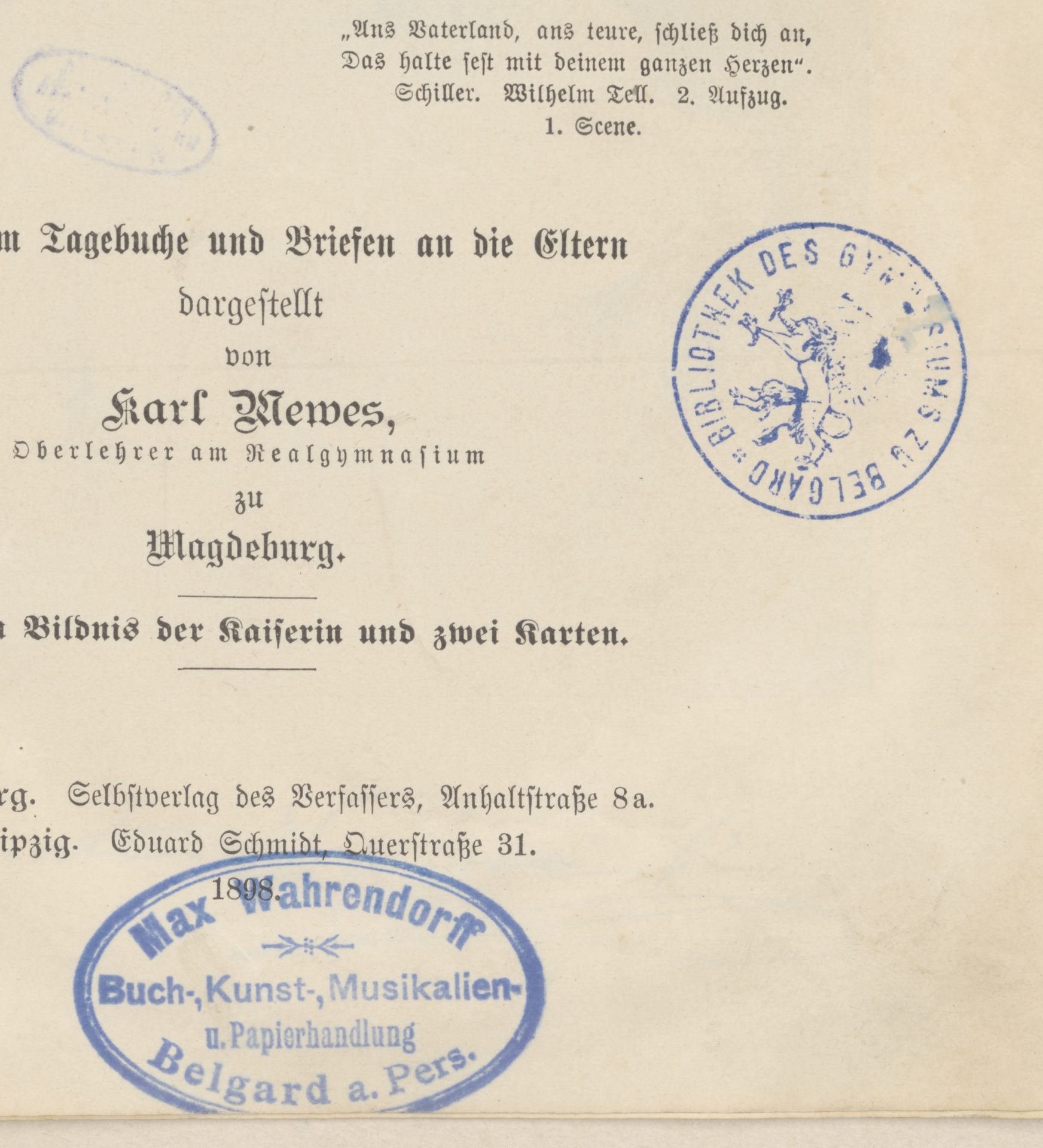 Leiden und Freuden eines kriegsfreiwilligen hallenser Studenten vom Regiment Nr 86 in den Kriegsjahren 1870-1871 - pieczątka owalna: księgarza Max Wahrendorff. Buch-Kunst-, Musikalien- u. Papierhandlung Belgard a. Pers.; pieczątka okrągła: Bibliothek des Gymnasiums zu Belgard