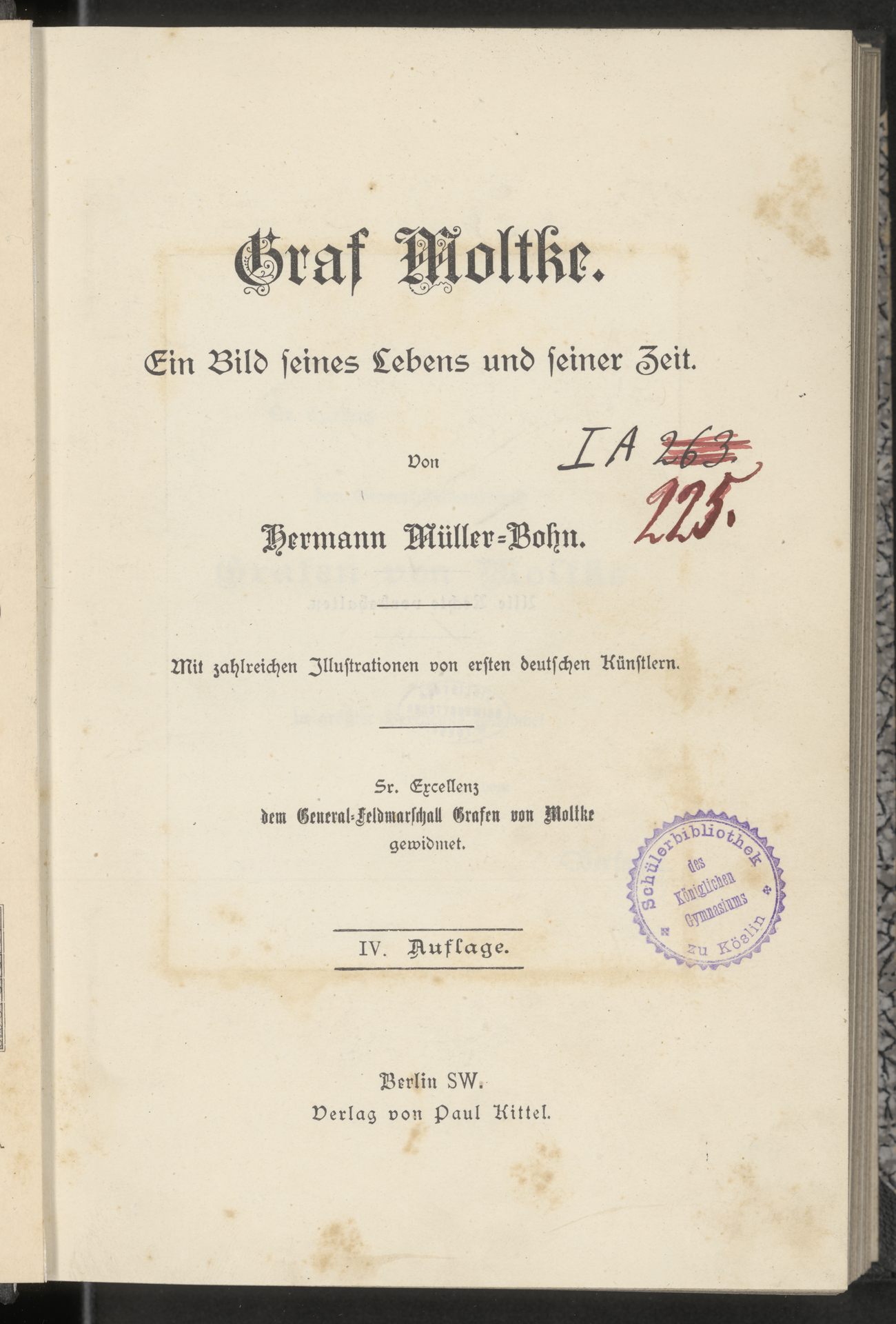 Graf Moltke - strona z sygnaturą oraz pieczątką okrągłą: Schülerbibliothek des Königlichen Gymnasium zu Köslin