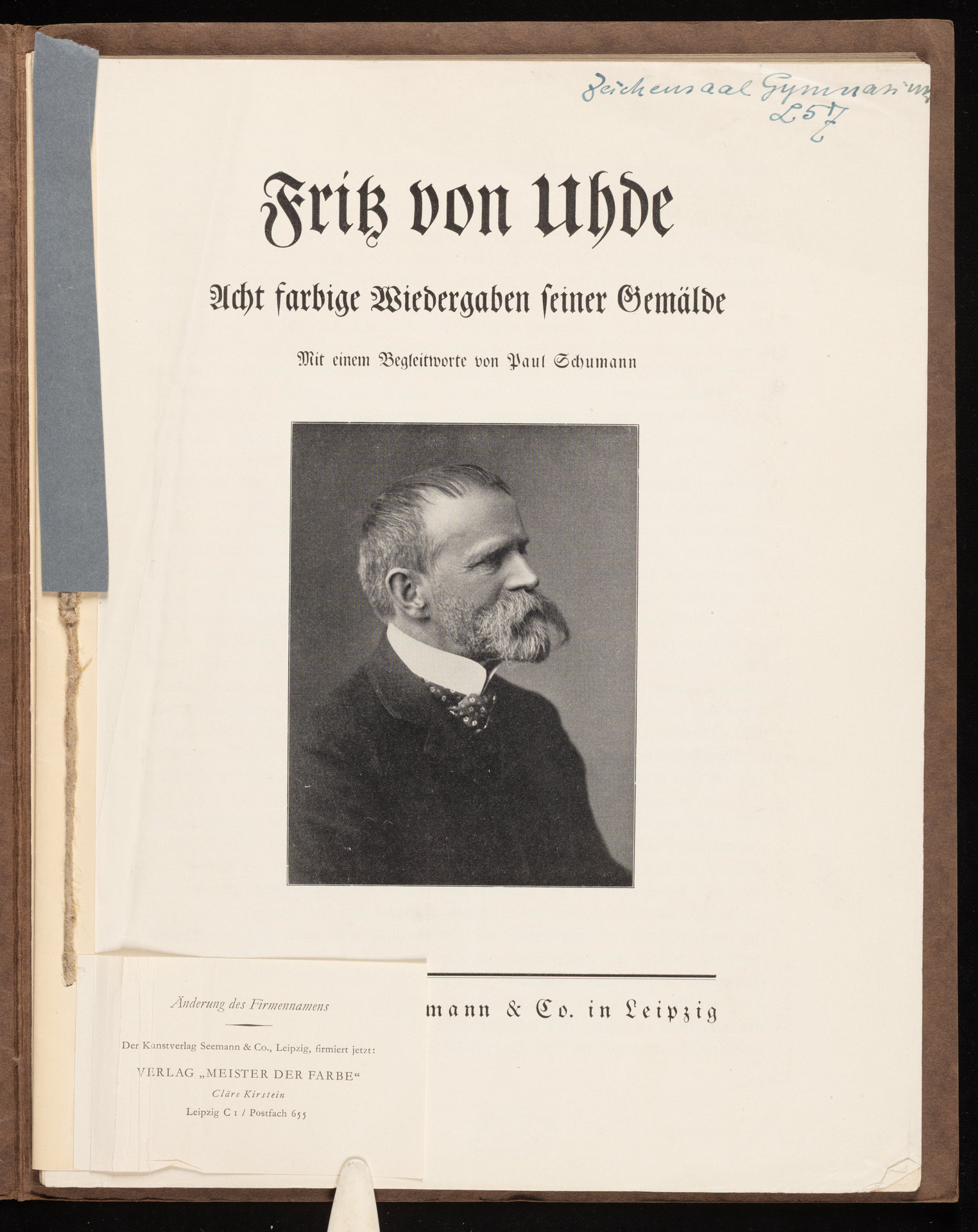 Fritz von Uhde. Acht farbige Wiedergaben seiner Gemälde. Mit einem Begleitworte. von Paul Schumann - strona tytułowa z zapiskami