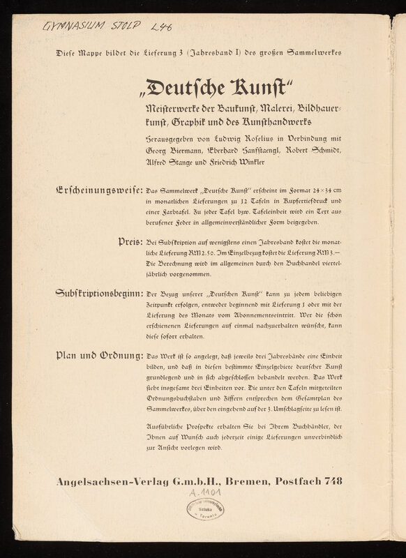 Der Isenheimer Altar des in Kolmar. 12 einfarbige und 1 mehrfarbige Tafel mit erläuterndem Text von Richard H. L.Hamann - odręczne zapiski proweniencyjne tuszem czarnym: Gymnasium Stolp