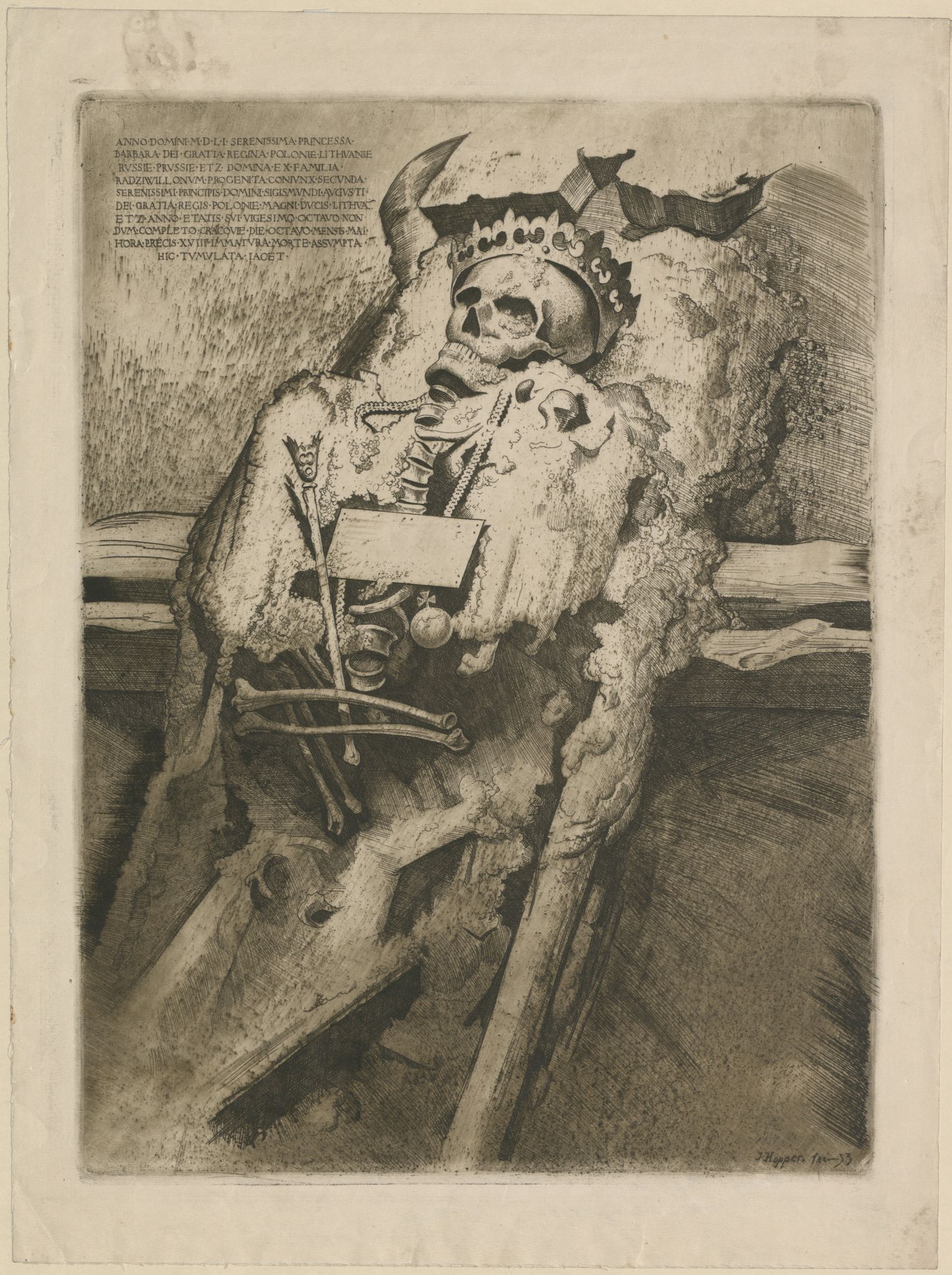 Na ryc. napis z płyty u góry po lewej: „ANNO DOMINI MDLI SERENISSIMA PRINCESSA BARBARA DEI GRATIA REGINA POLONIE LITHUANIE RUSSIE PRUSSIE ETZ. DOMINA EX FAMILIA RADZIWILLONUM PROGENTIA CONIUNX SECUNDA SERENISSIMI PRINCIPIS DOMINI SIGISMUNDI AUGUSTI / DEI GRATIA REGIS POLONIE MAGNI DUCIS LITHUA. ETZ. ANNO ETATIS SUI VIGESIMO OCTAVO NONDUM COMPLETO CRACOVIE DIE OCTAVO MENSIS MAI HORA PRECIS XVIII IMMATURA MONTE ASSUMPTA HIC TUMULATA IACET’