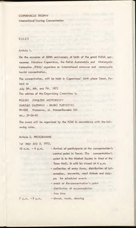 Copernicus Trophee : Concentration Turistique Internationale : Toruń/Poland 5-6-7 Juillet 1973