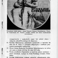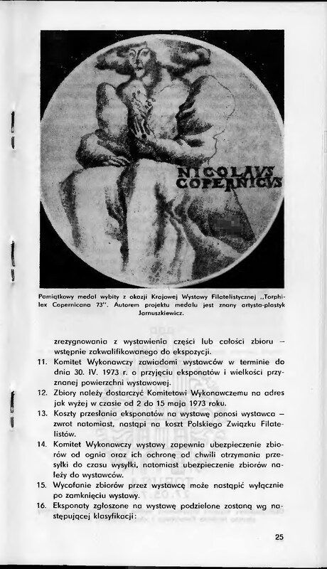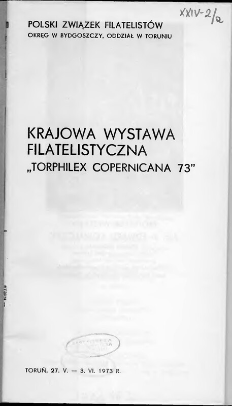 Katalog wystawy przygotowanej z okazji 500. rocznicy urodzin Mikołaja Kopernika. Zawiera szkice: Zenona Nowaka pt. "Toruń - gród Kopernika" i Mariana Waysa "Zarys dziejów ruchu filatelistycznego w Toruniu" oraz regulamun konkursu i spis eksponatów.