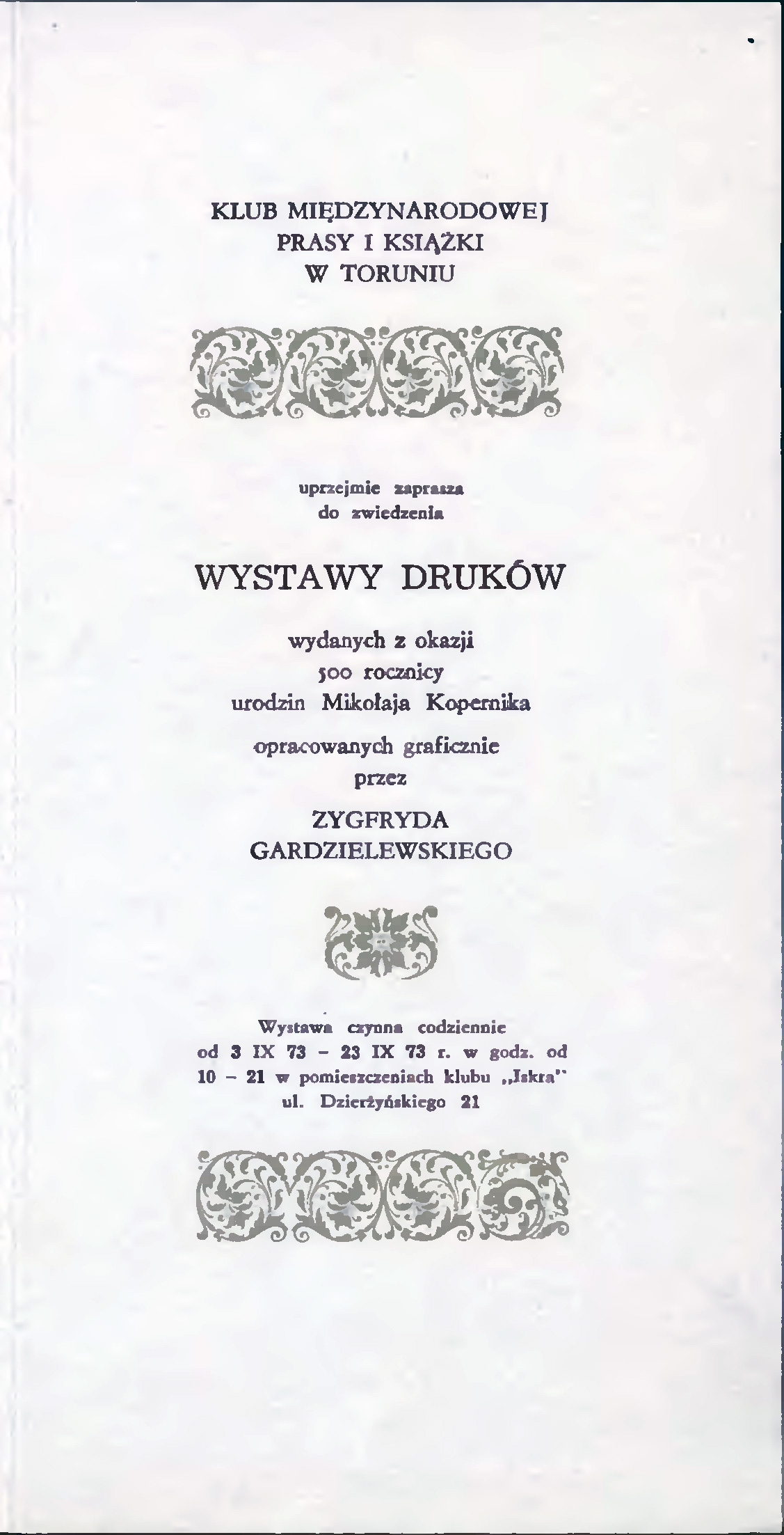 - Zaproszenie na wystawę druków wydanych z okazji 500. rocznicy urodzin Mikołaja Kopernika opracowanych graficznie przez Zygfryda Gardzielewskiego