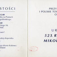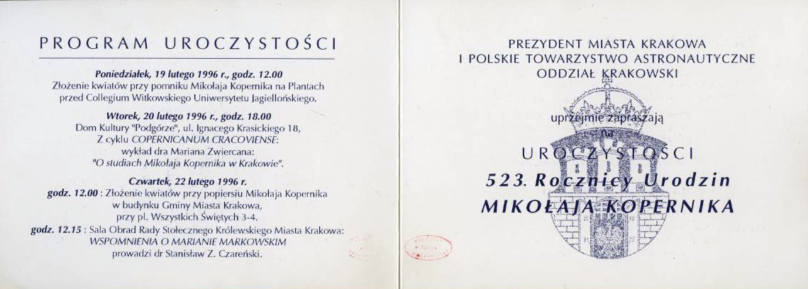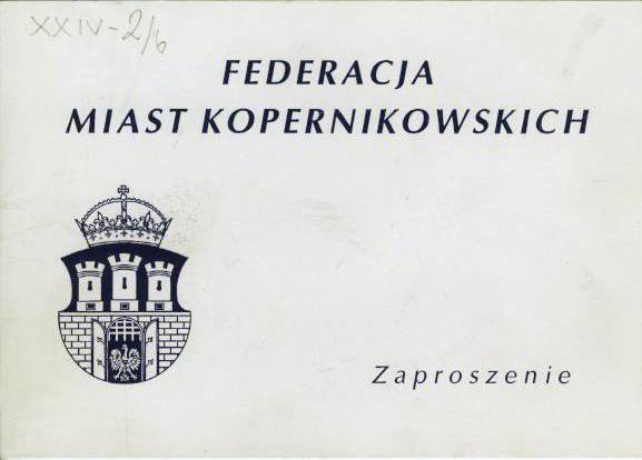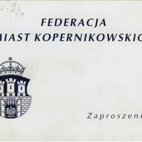 Zaproszenie na uroczystości 523. rocznicy urodzin Mikołaja Kopernika w Krakowie w dniach 19.02.1996-22.02.1996. Federacja Miast Kopernikowskich, związek miast związanych z życiem i działalnością Mikołaja Kopernika, powołany 19 lutego 1983 roku w Toruniu. Członkami Federacji są: Olsztyn, Bolonia, Frombork, Kraków, Toruń, Grudziądz, Lidzbark Warmiński, Włocławek i Braniewo.