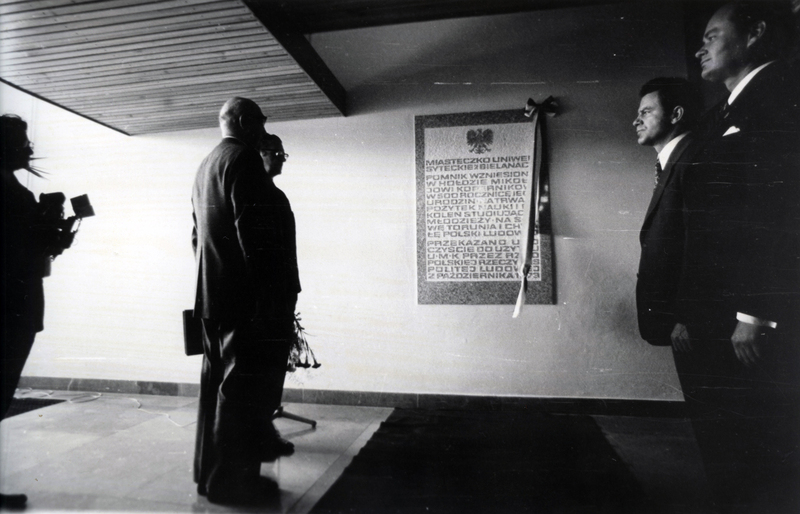 Odsłonięcie tablicy upamiętniającej przekazanie UMK miasteczka akademickiego na Bielanach, Toruń 2 października 1973 r.