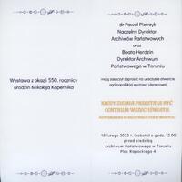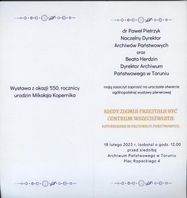 Zaproszenie na otwarcie wystawy plenerowej “Kiedy Ziemia przestała być centrum Wszechświata”, 18 lutego 2023 r. przed siedzibą Archiwum Państwowego w Toruniu.