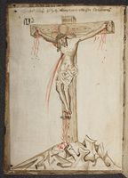 Wyklejka górnej okładziny: Chrystusa ukrzyżowany, rysunek piórkiem; nota własnościowa i sygnatura dawnej Państwowej i Uniwersyteckiej Biblioteki w Królewcu