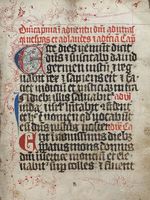 K. 183v: inicjał C(um), błękitno-czerwony, o wys. 10 wersów. W oku litery przedstawienie twarzy kobiecej okolonej welonem (zapewne wizerunek św. Brygidy).