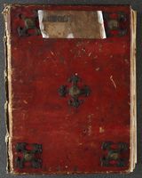 Wyklejka górnej okładziny – rysunek Chrystus ukrzyżowany, nota: "Hoc volumen reliquit frater Johannes Albrechtow ecclesie sue Sambiensi" (brat Jan Albrechtau legował tę księgę bibliotece katedralnej w Królewcu) i sygnatura Państwowej i Uniwersyteckiej Biblioteki w Królewcu