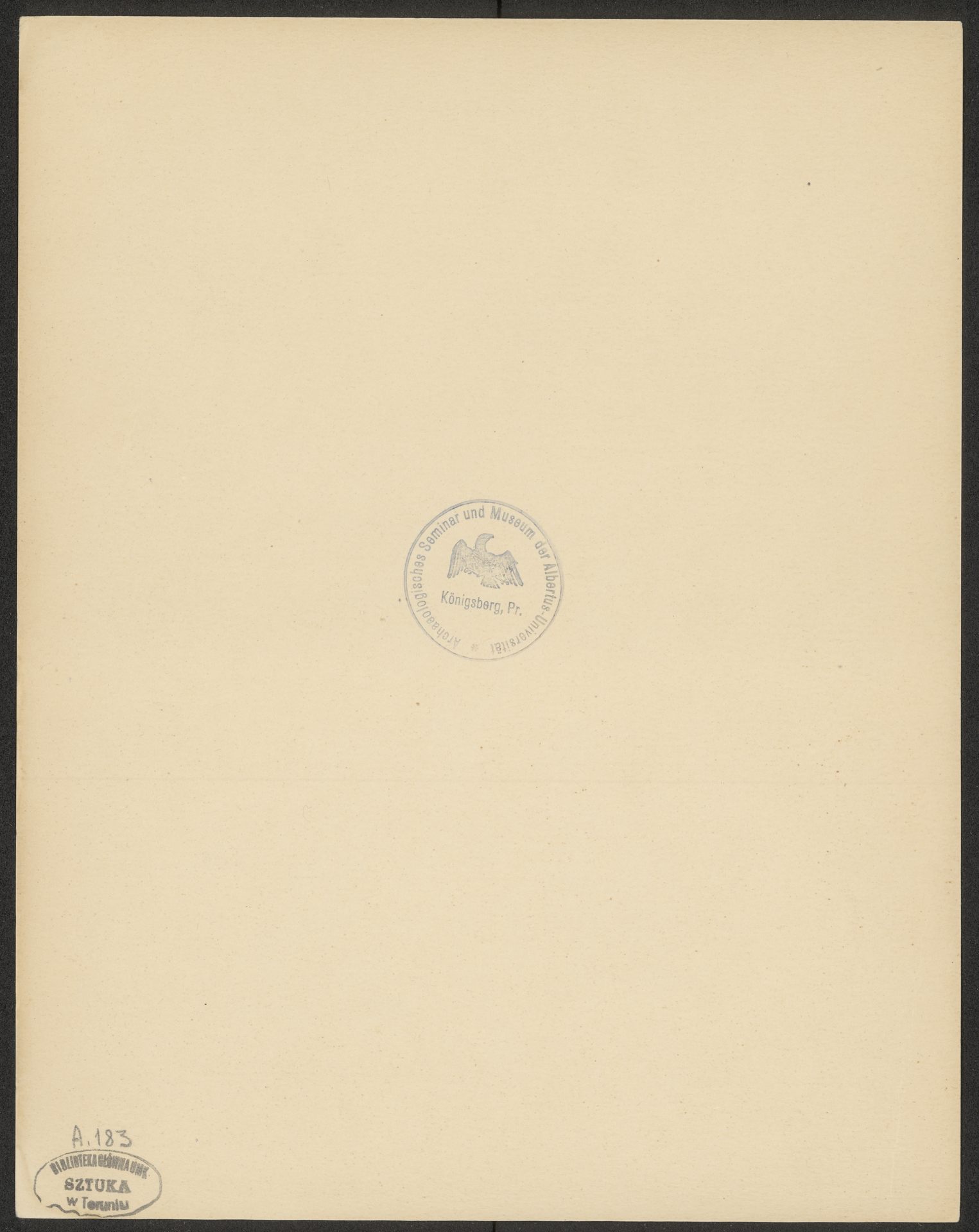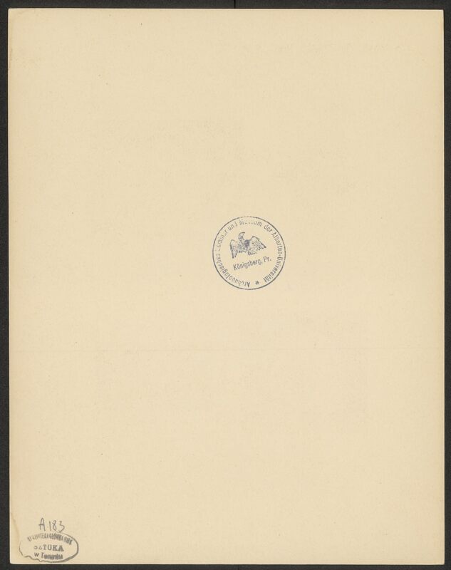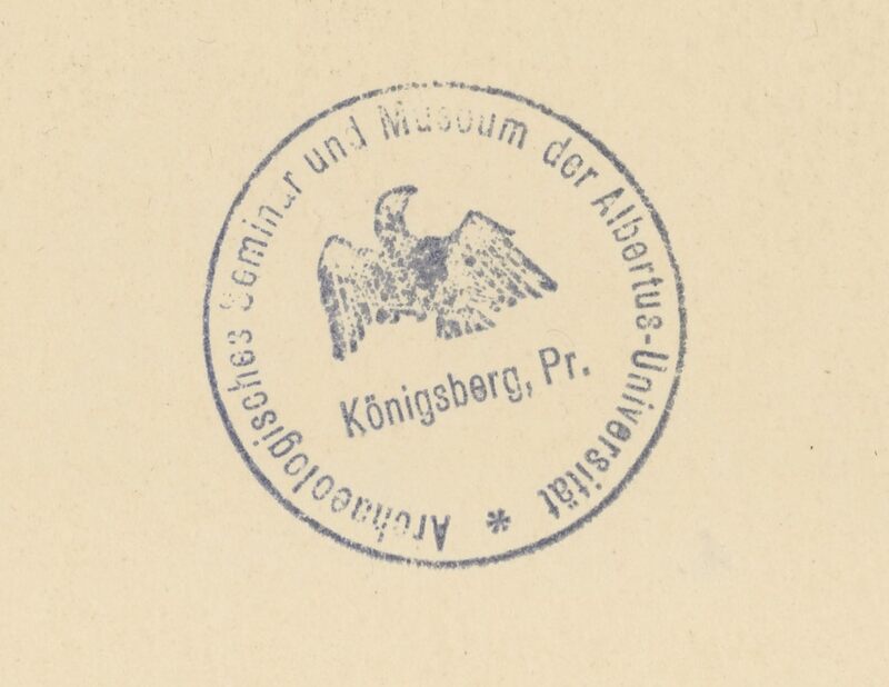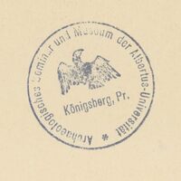 - Okrągła pieczęć na awersie tablic: Archeologisches Semminar und Museum der Albertus-Universität Königsberg, Pr.