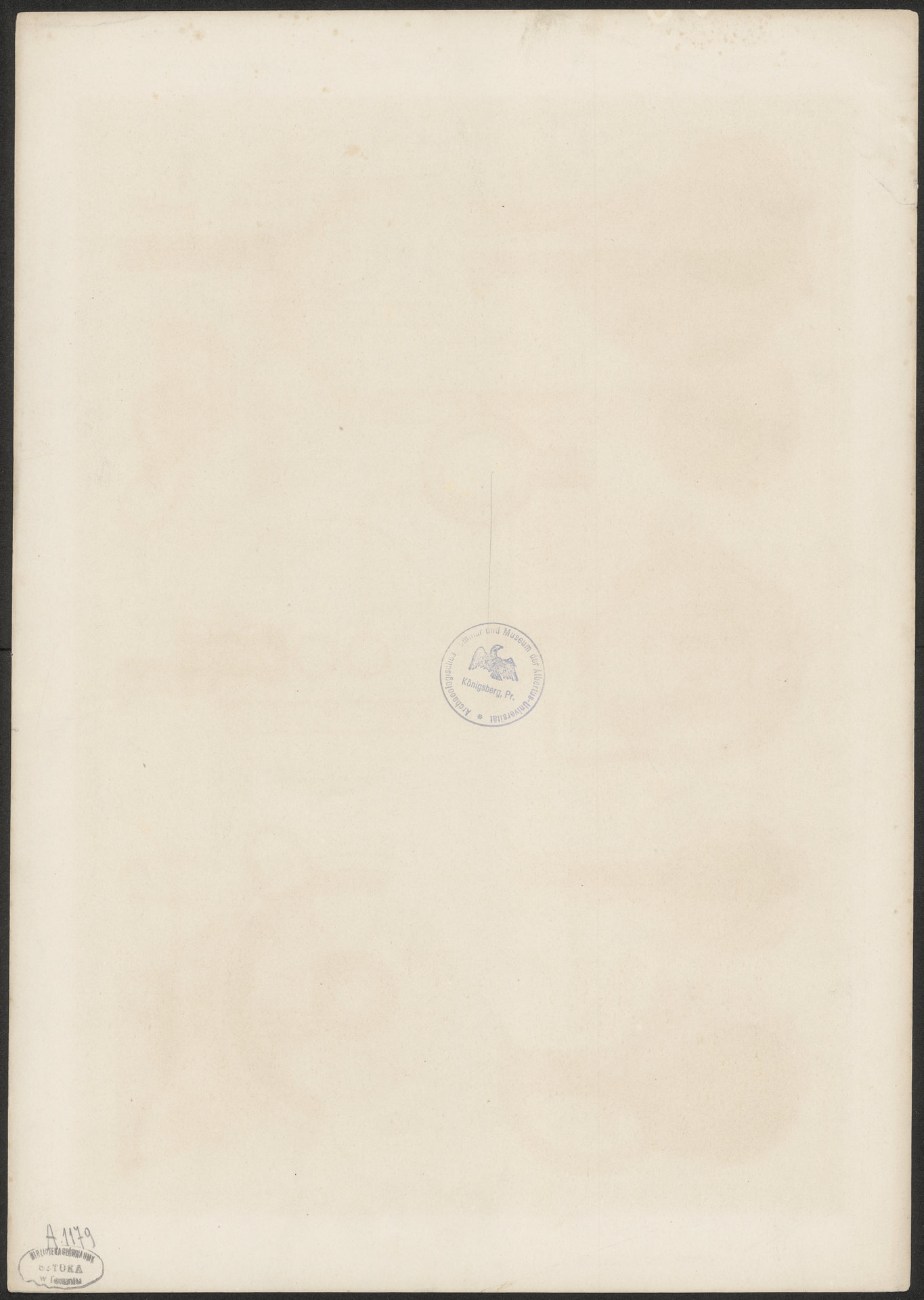 - Okrągła pieczęć na awersie tablic: Archeologisches Semminar und Museum der Albertus-Universität Königsberg, Pr.
