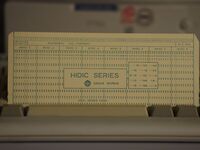Nieco dalej w sali wystawowej znalazła się Karta serii Hitachi Omika Control HIDIC - to karta kontrolna stworzona przez firmę Hitachi Corporation. Karty tego typu nazywane były kartami IBM - ze względu na format i sposób dziurkowania zaproponowany przez tą firmę. Karta była przeznaczona do zastosowań w przemyśle elektronicznym i automatyce przemysłowej. Zapewniała zaawansowane możliwości kontroli i monitorowania systemów przemysłowych.