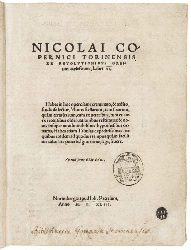 Nicolai Copernici Torinensis De Revolvtionibvs Orbium coelestium, Libri VI. Habes in hoc opere iam recens nato, [et] aedito, studiose lector, Motus stellarum, tam fixarum, quam erraticarum, cum ex ueteribus, tum etiam ex recentibus obseruationibus restitutos: [et] nouis insuper ac admirabilibus hypothesibus ornatos. Habes etiam Tabulas expeditissimas, ex quibus eosdem ad quoduis tempus quam facillime calculare poteris. Igitur eme, lege, fruere.