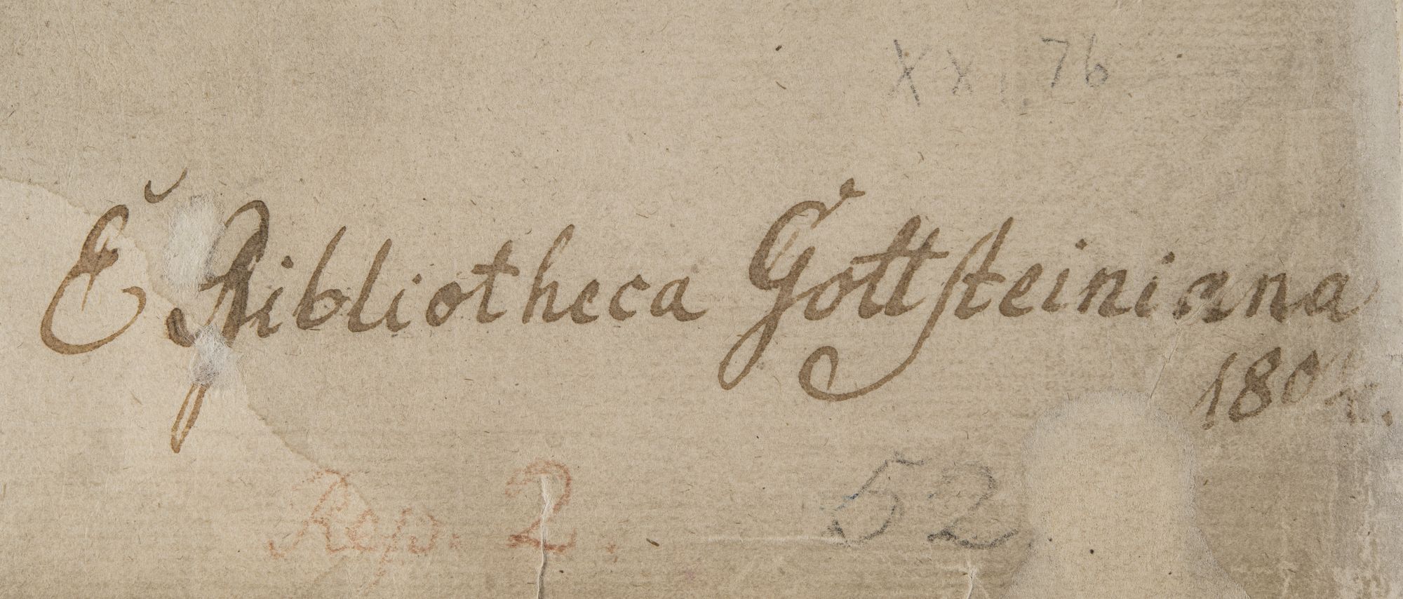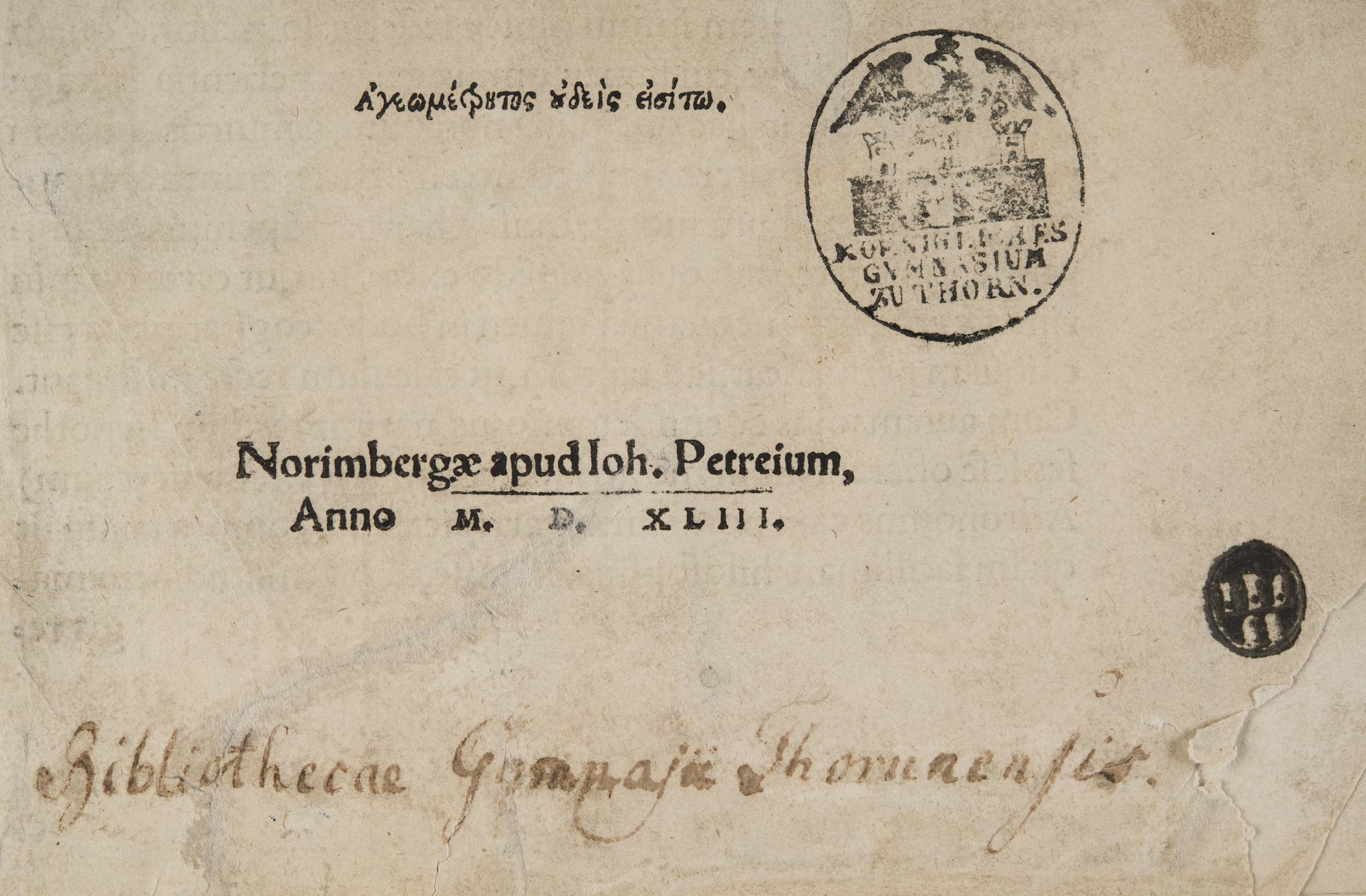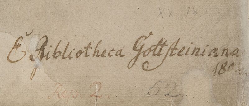 Zapiska donacyjna informuje, że podarowany został bibliotece na początku XIX w. przez rodzinę Gottsteinów, toruńskich patrycjuszy, właścicieli Apteki Królewskiej: „Ex Bibliotheca Gottsteiniana 180[…] Bibliothecae Gymnasii Thorunensis”. Na górnej okładzinie oprawy znajduje się nieznany superekslibris poprzedniego właściciela.