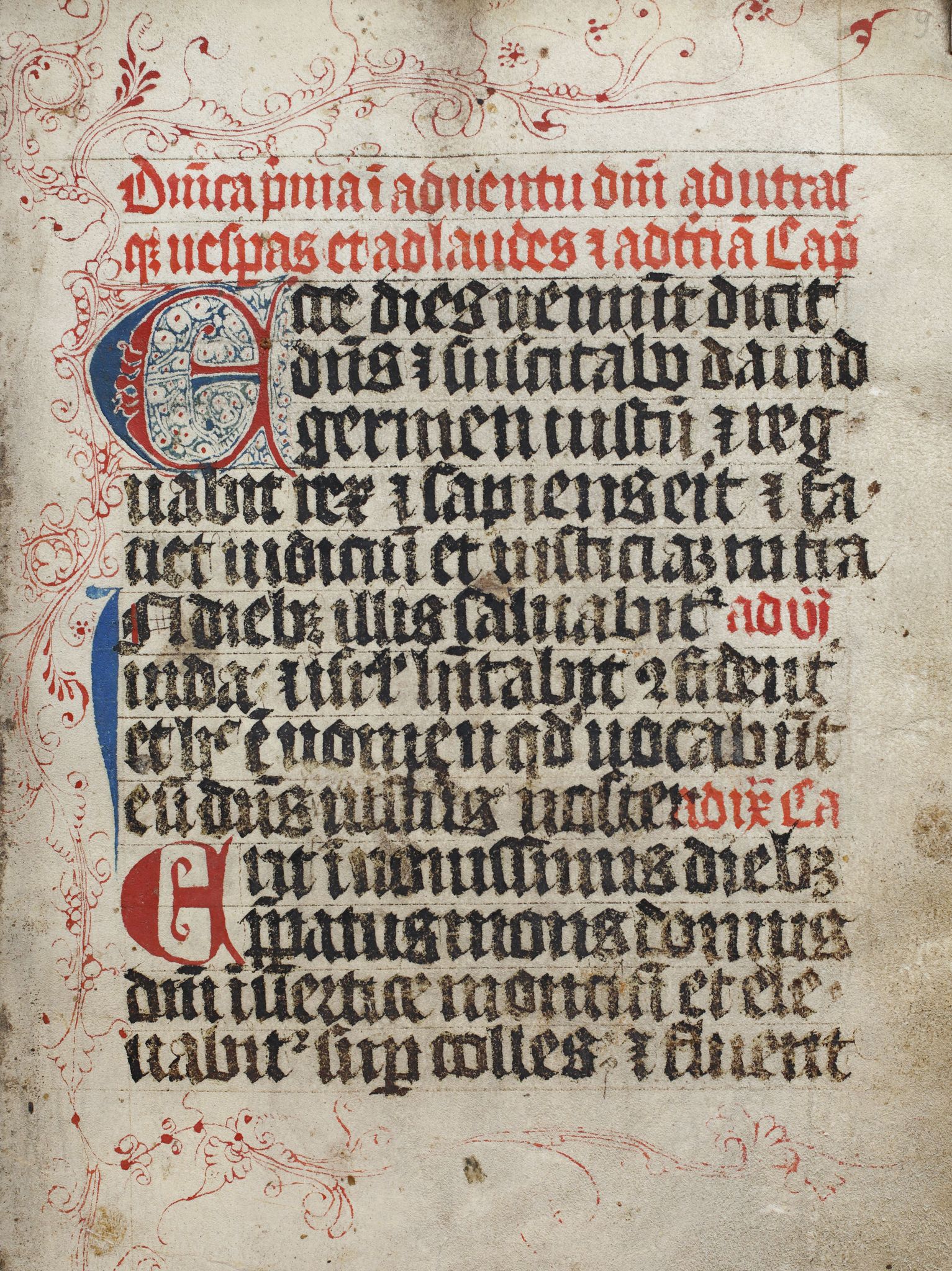 Zdobienia: pięć inicjałów kaligraficznych o dwubarwnym, czerwono-niebieskim korpusie. Inicjały poszczególnych lekcji i kolekt na przemian czerwone i niebieskie o wys. 2 wersów.